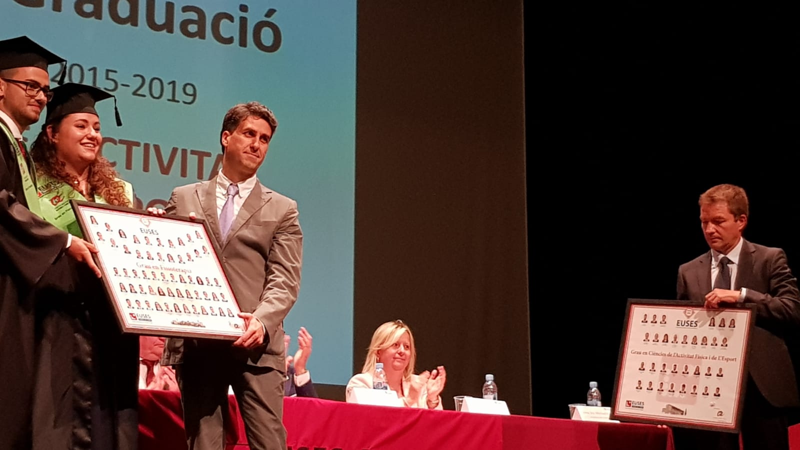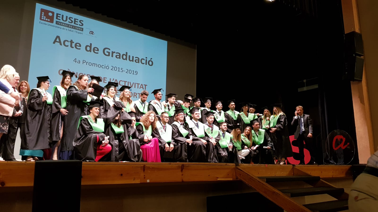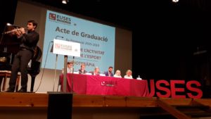 L’Escola Universitària de la Salut i l’Esport ha realitzat aquesta tarda al Teatre-Auditori Felip Pedrell de Tortosa l’acte de graduació de les promocions 2015-2019 (la 4a que surt d’EUSES Terres de l’Ebre-URV) dels graus en Fisioteràpia i en Ciències de l’Activitat Física i de l’Esport. Un total de 48 estudiants (33 de Fisioteràpia i 15 de CAFE) han completat una de les etapes més importants de la seva formació acadèmica i ja estan preparats per irrompre en el mercat laboral. L’acte de graduació, que ha estat presentat pel periodista Ximo Rambla, ha comptat amb la presència de Meritxell Roigé (Alcaldessa de Tortosa), Cinta Espuny (representat territorial de l’Esport de la Generalitat de Catalunya a les Terres de l’Ebre i Regidora d’Esports, Ensenyament i Universitats de l’Ajuntament de Tortosa), Ramon Bel (Regidor de Mitjans de Comunicació i Festes i 4t Tinent d’Alcalde de l’Ajuntament d’Amposta), Jordi Sardà (director del Campus de Terres de l’Ebre de la Universitat Rovira i Virgili), Xavier Nadal (director d’EUSES Terres de l’Ebre i del Grau en CAFE) i Jordi Casado (director del Grau en Fisioteràpia). En els parlaments, tots ells han destacat l’esforç dels nous graduats durant els quatre anys i els han encoratjat a obrir-se camí en el món laboral sense deixar mai de formar-se.