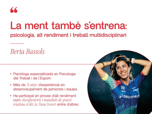 Berta Bassols és psicòloga especialitzada en Psicologia del Treball i de l’Esport. Amb més de vuit anys d’experiència en desenvolupament de persones i equips, acompanya professionals i esportistes en processos de creixement, benestar i rendiment. Fundadora de Berta Bassols – Psicologia, combina tècniques de coaching, PNL i psicologia positiva per potenciar el potencial i la motivació. Ha competit en proves d’alt rendiment com la Titan Desert del Marroc, Campionats del Món i triatlons d’elit a nivell de Catalunya i Espanya, entre d’altres.