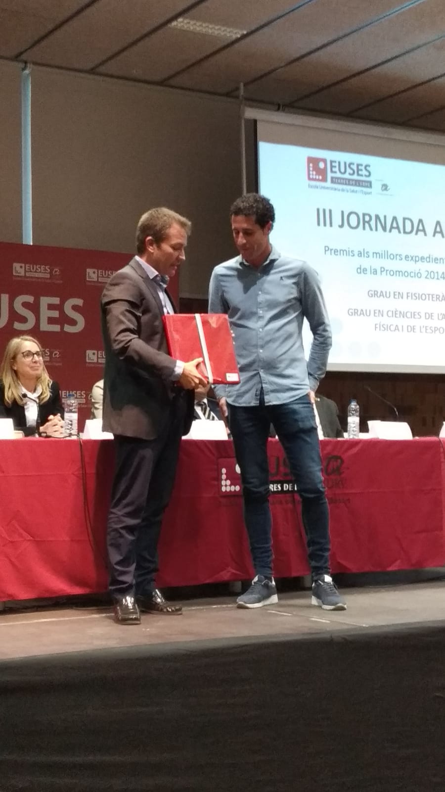 Durant la jornada anual es van fer entrega dels premis extraordinaris als millors expedients del curs acadèmic 2017/18, que van recaure sobre Sébastien Anton (Fisioteràpia), el qual no va poder ser-hi present però va enviar un vídeo d’agraïment que es va projectar durant l’acte; i Adrià Calvó (Ciències de l’Activitat Física i l’Esport), que va rebre el premi de mans del cap d’estudis de CAFE, Pau Cecília; una placa que li va lliurar Sílvia Roche i un any d’inscripció gratuïta al COPLEFC que li va fer entrega Pere Manuel.