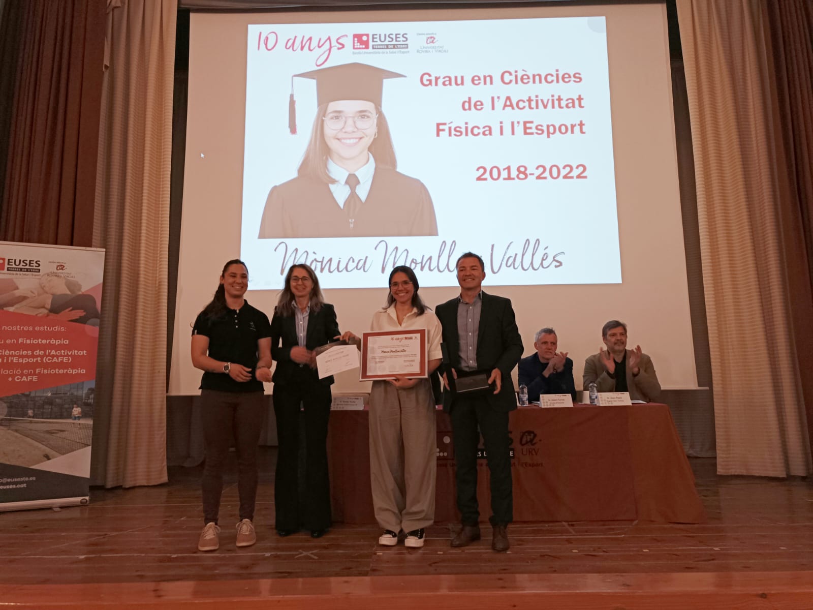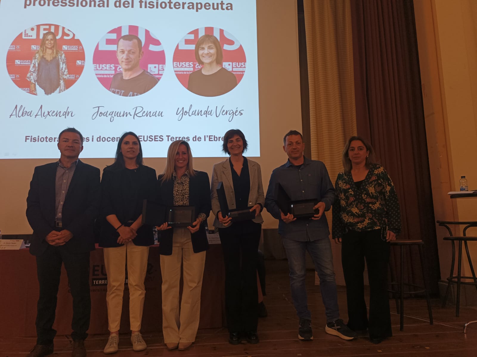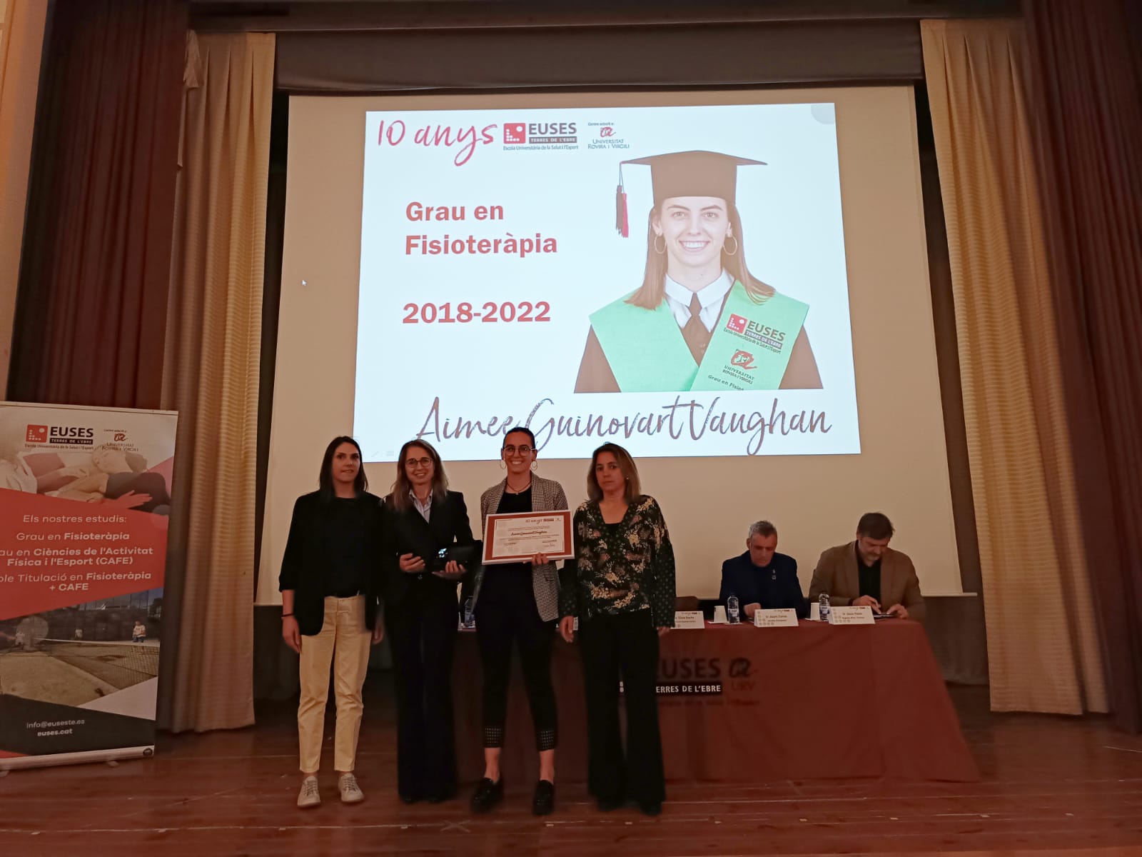 Després de la presentació de l’associació per part de la Directora d’Alumni, la Sra. Sílvia Roche, i de la introducció del Director d’EUSES TE, el Sr. Xavi Nadal, s’ha donat pas a l’entrega dels reconeixements als millors expedients acadèmics tant del Grau en Fisioteràpia com del Grau en CAFE, que han recaigut sobre Aimee Guinovart Vaughan i Mònica Monllau Vallés respectivament. La Directora de Fisioteràpia, la Sra. Carla Curto, i la Cap d’Estudis, la Dra. Núria Besalduch, han entregat el premi a Aimee Guinovart, mentre que per al premi de la Mònica Monllau s’ha comptat amb la presència de Sònia Serratosa, delegada del COPLEFC a les Terres de l’Ebre, qui a la vegada li ha entregat l’any de col·legiació gratuïta que li ha atorgat el col·legi.