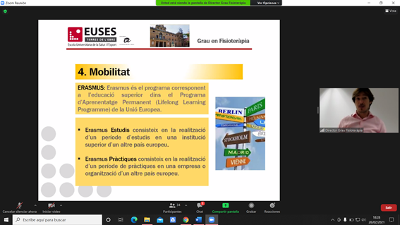 Prop de mig centenar d’interessats en els graus impartits al Campus de Terres de l’Ebre de l’Escola Universitària de la Salut i l’Esport han participat aquest passat divendres 26 de febrer en la nova Jornada de Portes Obertes Virtual que s’ha realitzat a través de la plataforma Zoom. Els i les interessades han pogut connectar-se per rebre tota la informació dels nostres estudis: el Grau en Ciències de l’Activitat Física i l’Esport, el Grau en Fisioteràpia i la Doble Titulació (CAFiE + Fisioteràpia).