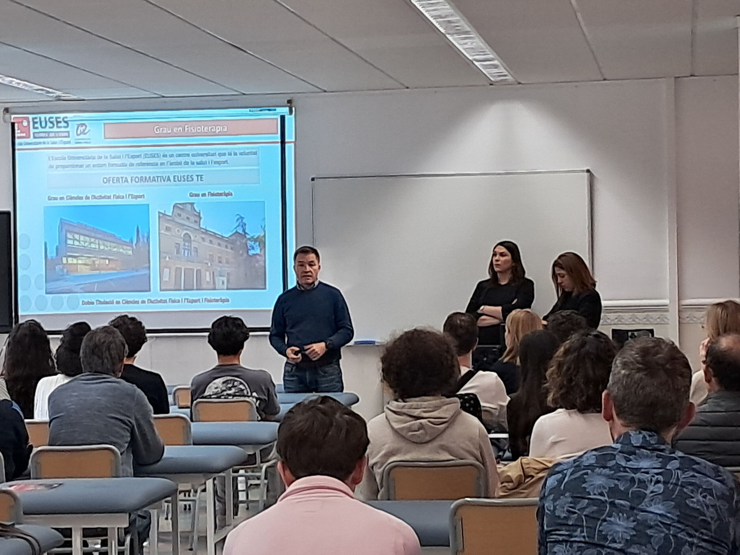 A l’edifici Seminari de Tortosa, els interessats a cursar el Grau en Fisioteràpia o la Doble Titulació van tenir l’oportunitat d’escoltar la introducció del director acadèmic de l’EUSES, Xavier Nadal, que va fer una pinzellada sobre el centre i va parlar també de l’oferta formativa. Carla Curto i la Dra Núria Besalduch, directora i cap d’estudis del Grau en Fisioteràpia respectivament, van incidir en el pla d’estudis, les pràctiques, calendari i horaris i també el professorat i els voluntariats. Finalment, Meri Cecília, de la secretaria acadèmica, va marcar els itineraris sobre aspectes més logístics com el procés de preinscripció i matriculació i les beques. La jornada va comptar amb la col·laboració de les estudiants de Fisioteràpia i representants de l’associació d’estudiants ATEF Nathalie Soler i Maëlys Adedjoumon, i de l’estudiant de Doble Titulació Arnau Berzosa, qui van explicar el seu dia a dia com a estudiants a EUSES, i van aprofitar per mostrar els serveis que l’associació ofereix als nostres alumnes.