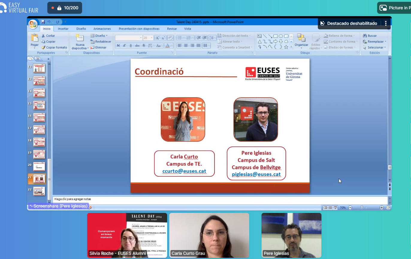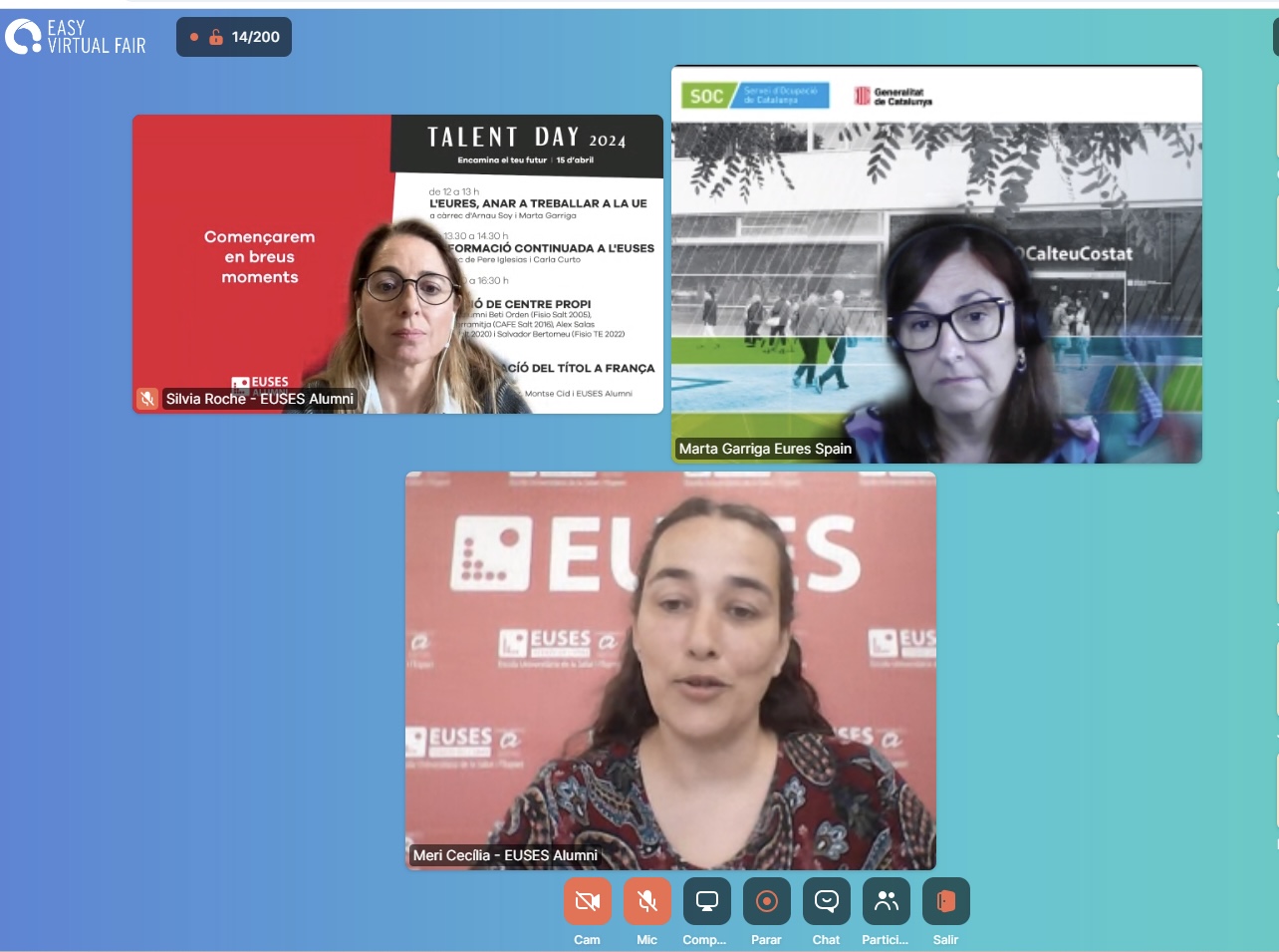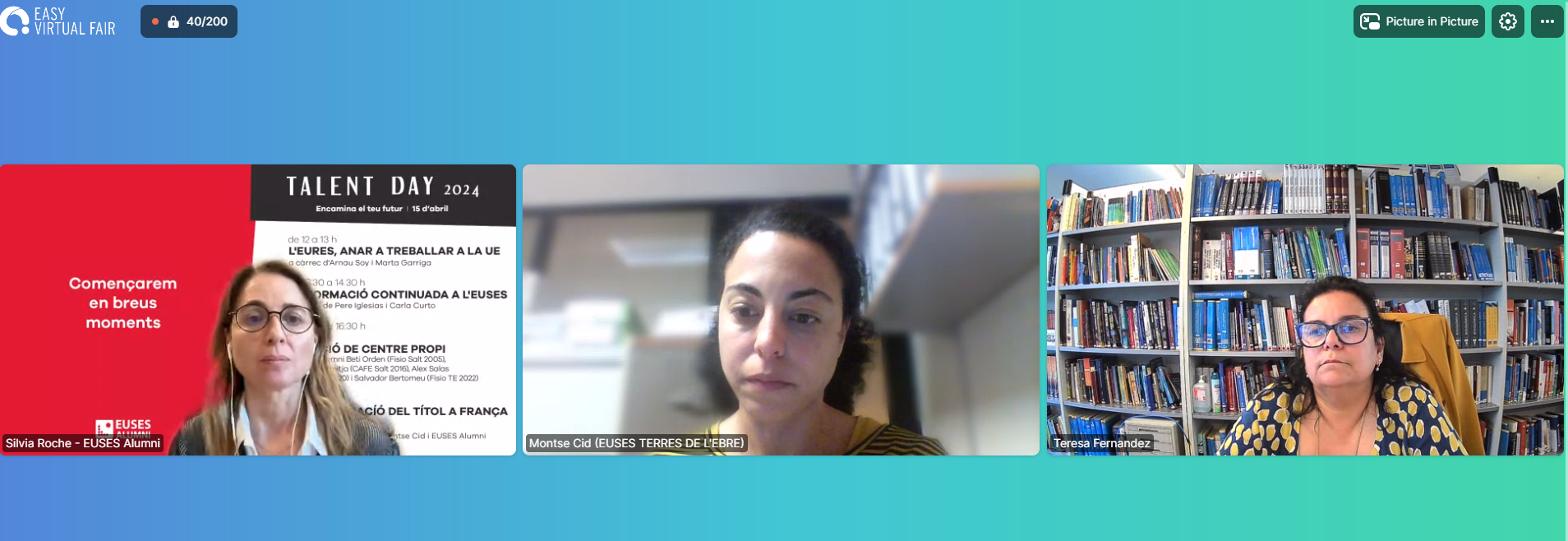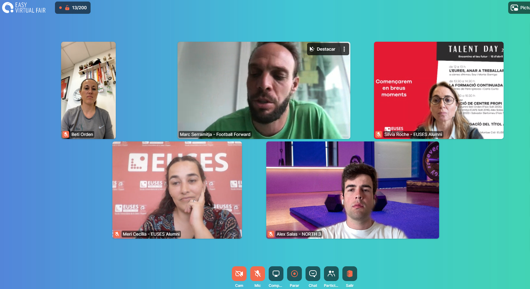 La Fira Virtual de l’Ocupació i Orientació Professional de l’Escola Universitària de la Salut i l’Esport va posar punt i final a la seva quarta edició havent assolit tots els objectius marcats i amb unes xifres òptimes de participació. El Talent Day, que ha tingut el seu centre neuràlgic en el Campus de Salt però que s’ha pogut seguir virtualment des dels altres campus del grup (Terres de l’Ebre i Bellvitge), ha superat els números de les passades edicions i des de l’organització, EUSES Alumni, ja es té la mirada posada sobre els nous reptes a assolir per a la propera edició.