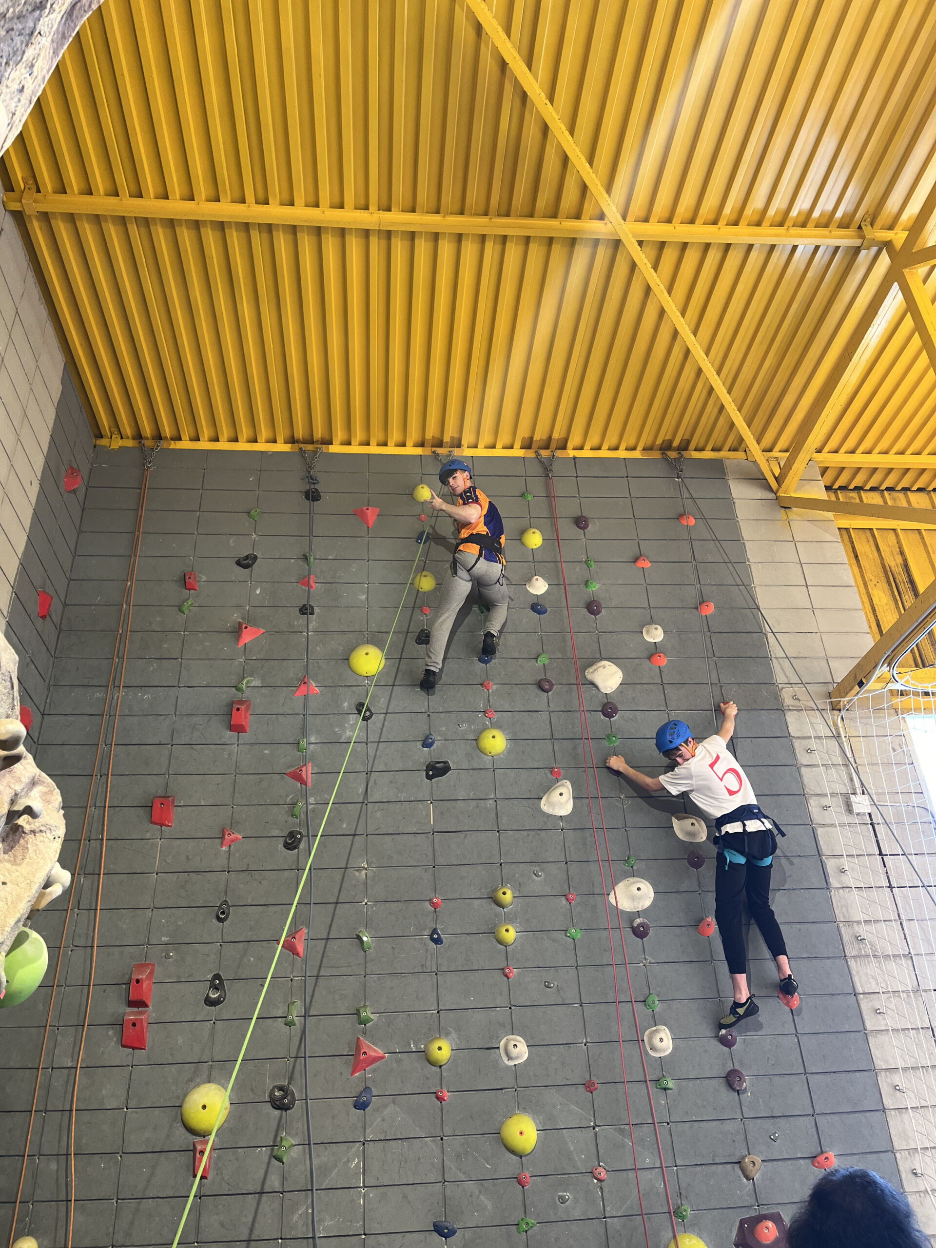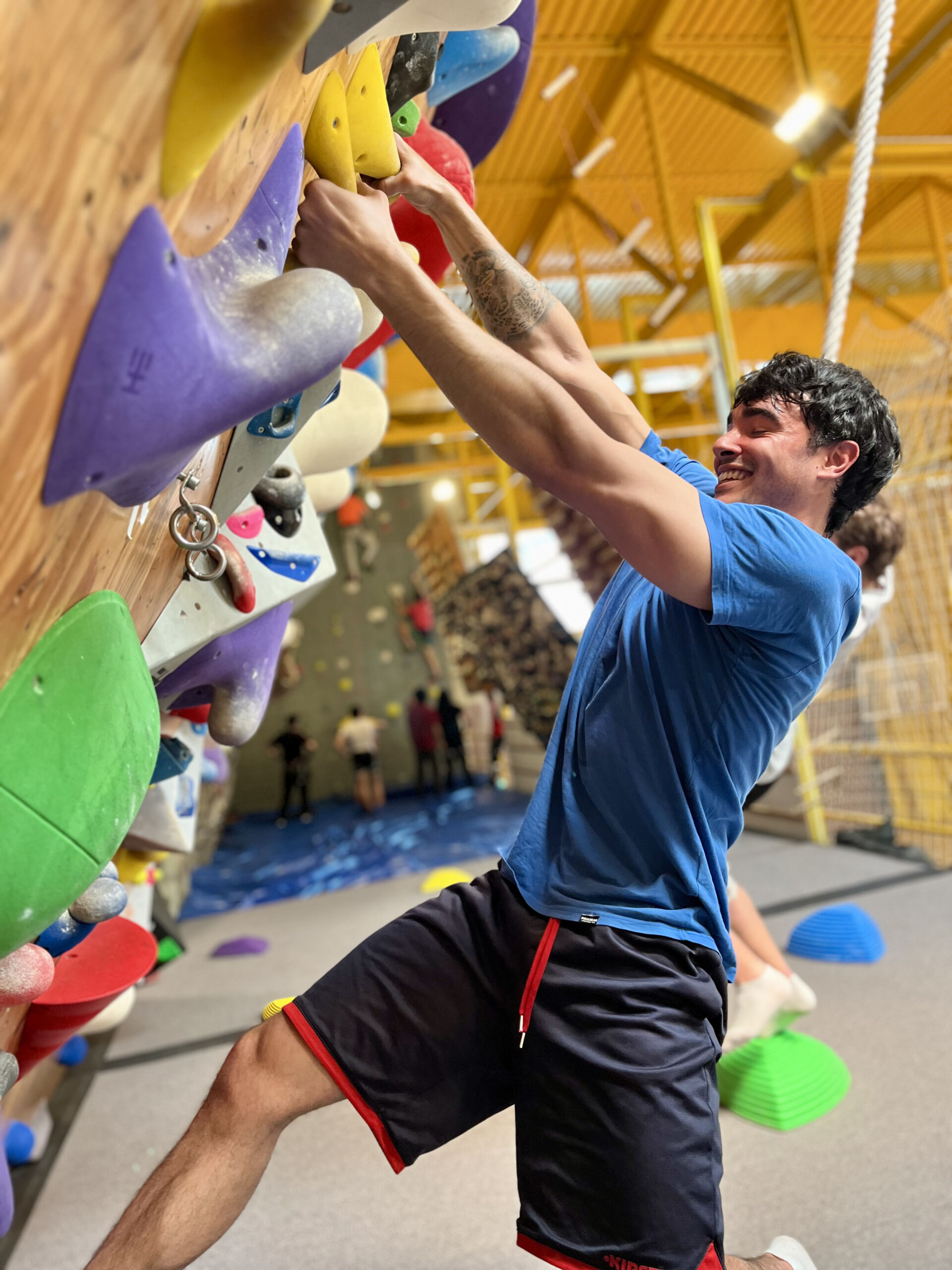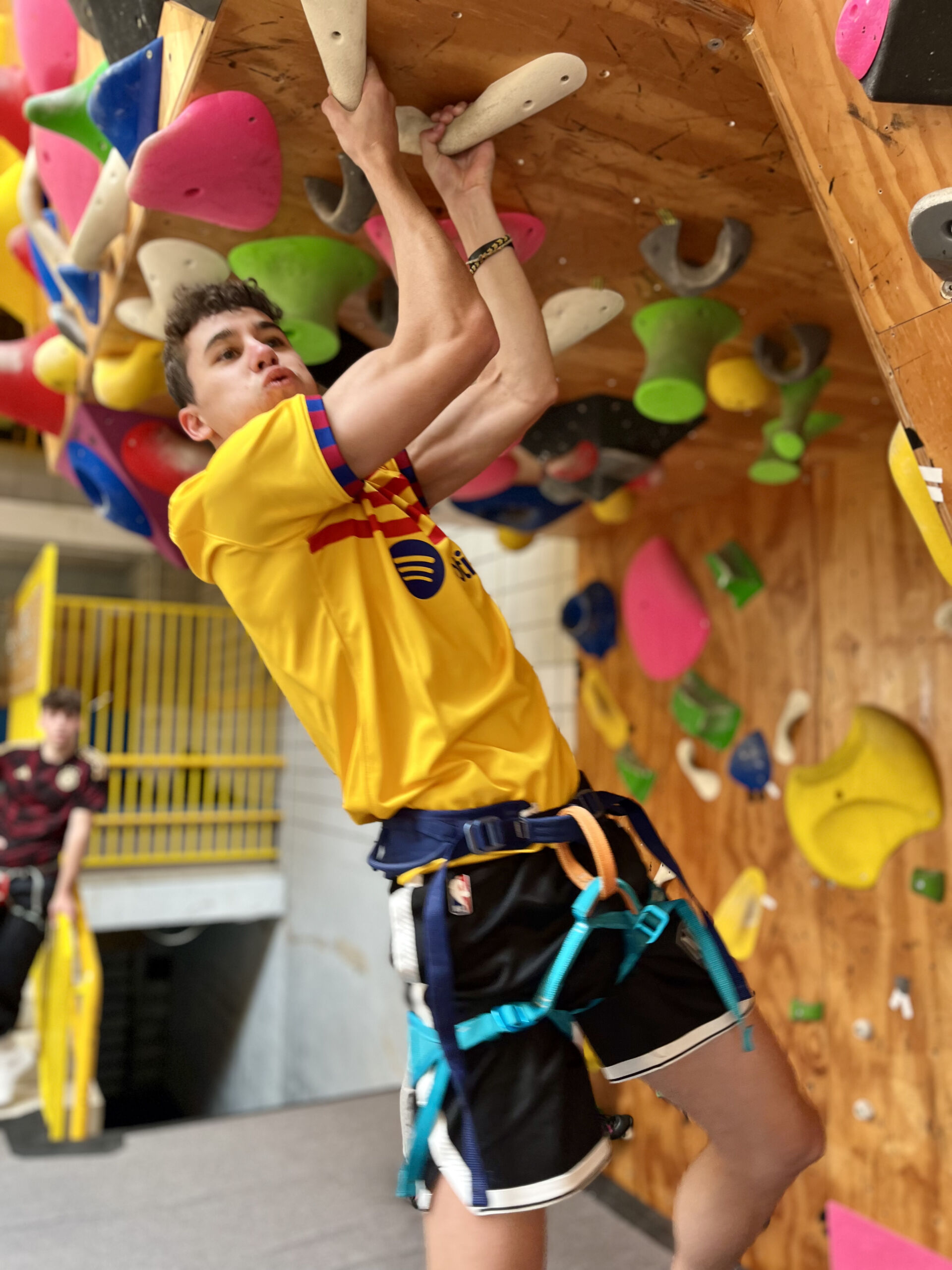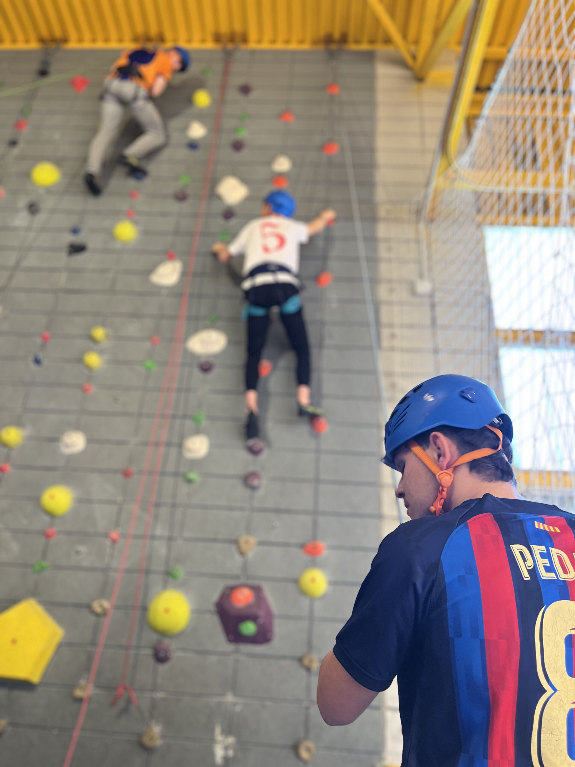 Aquesta activitat s’ha estructurat en tres espais diferenciats dins del rocòdrom. En el primer espai, l’alumnat ha realitzat un petit circuit de reptes que combinaven moviments d’agilitat i desplaçaments laterals en paret a poca alçada. En el segon, han practicat l’escalada de tipus “bloc”, una modalitat que consisteix en superar rutes curtes però intenses sense l’ús de cordes, tot treballant la tècnica i la força de manera progressiva. Finalment, en el tercer espai, han pogut experimentar l’escalada amb corda en paret vertical, aprenent també a assegurar als companys amb un dispositiu específic de seguretat.