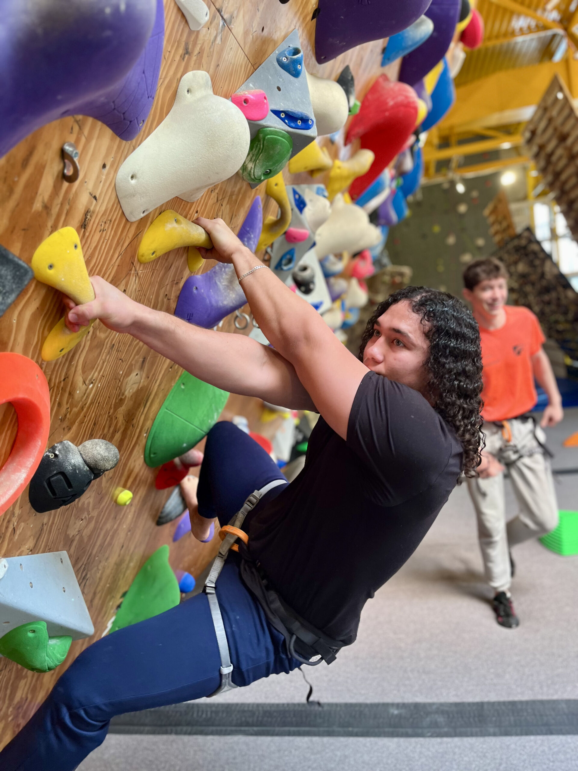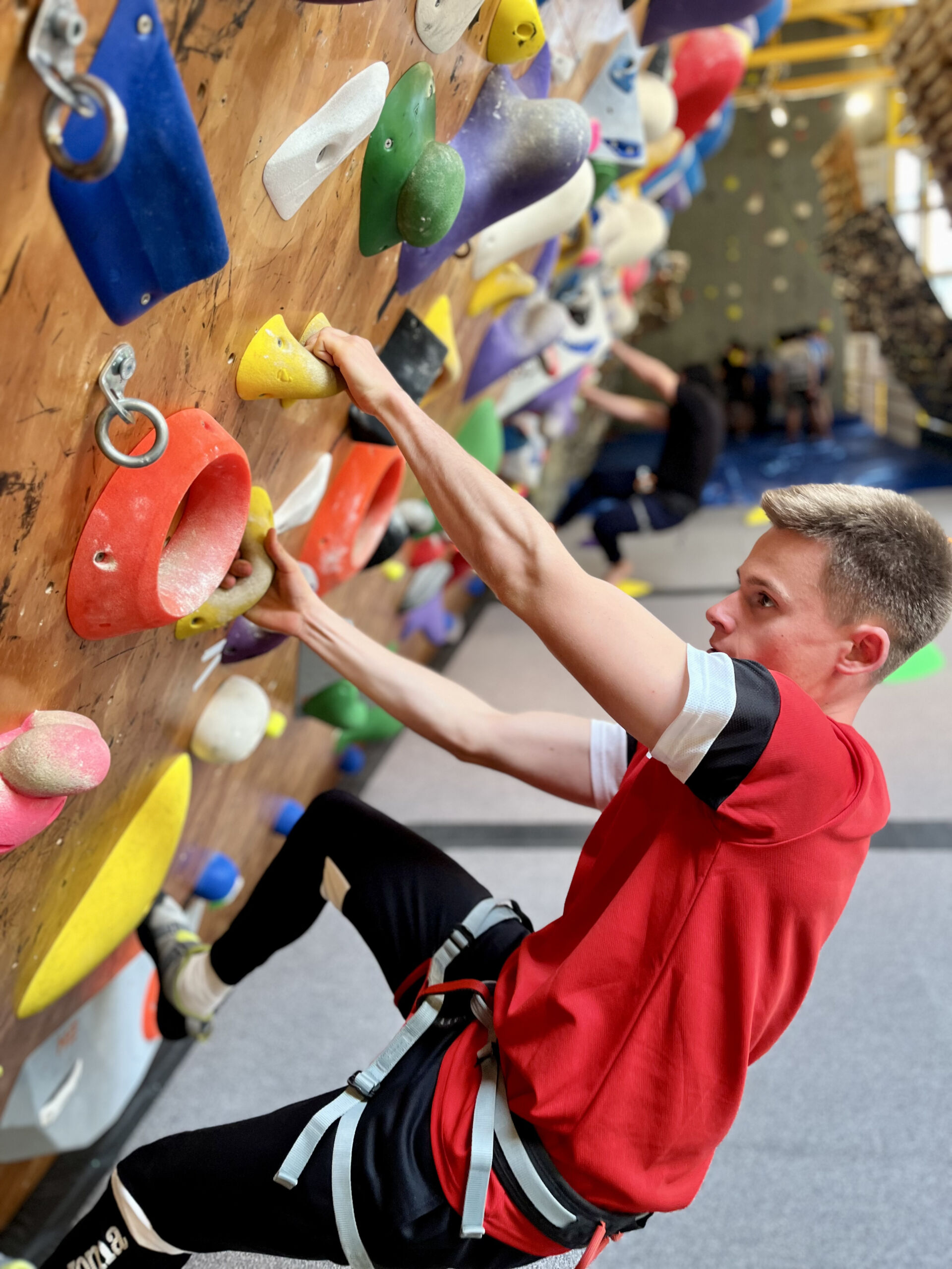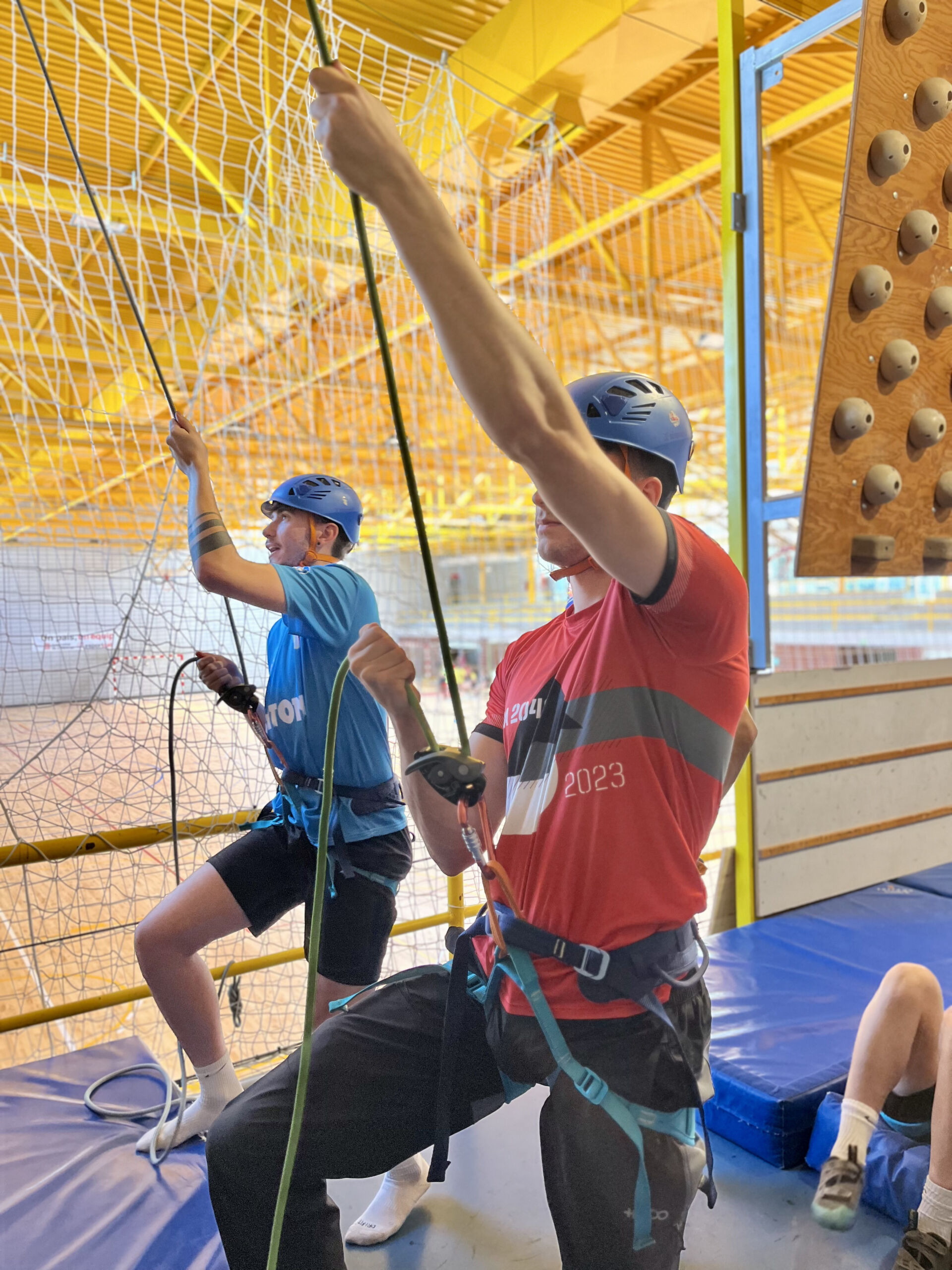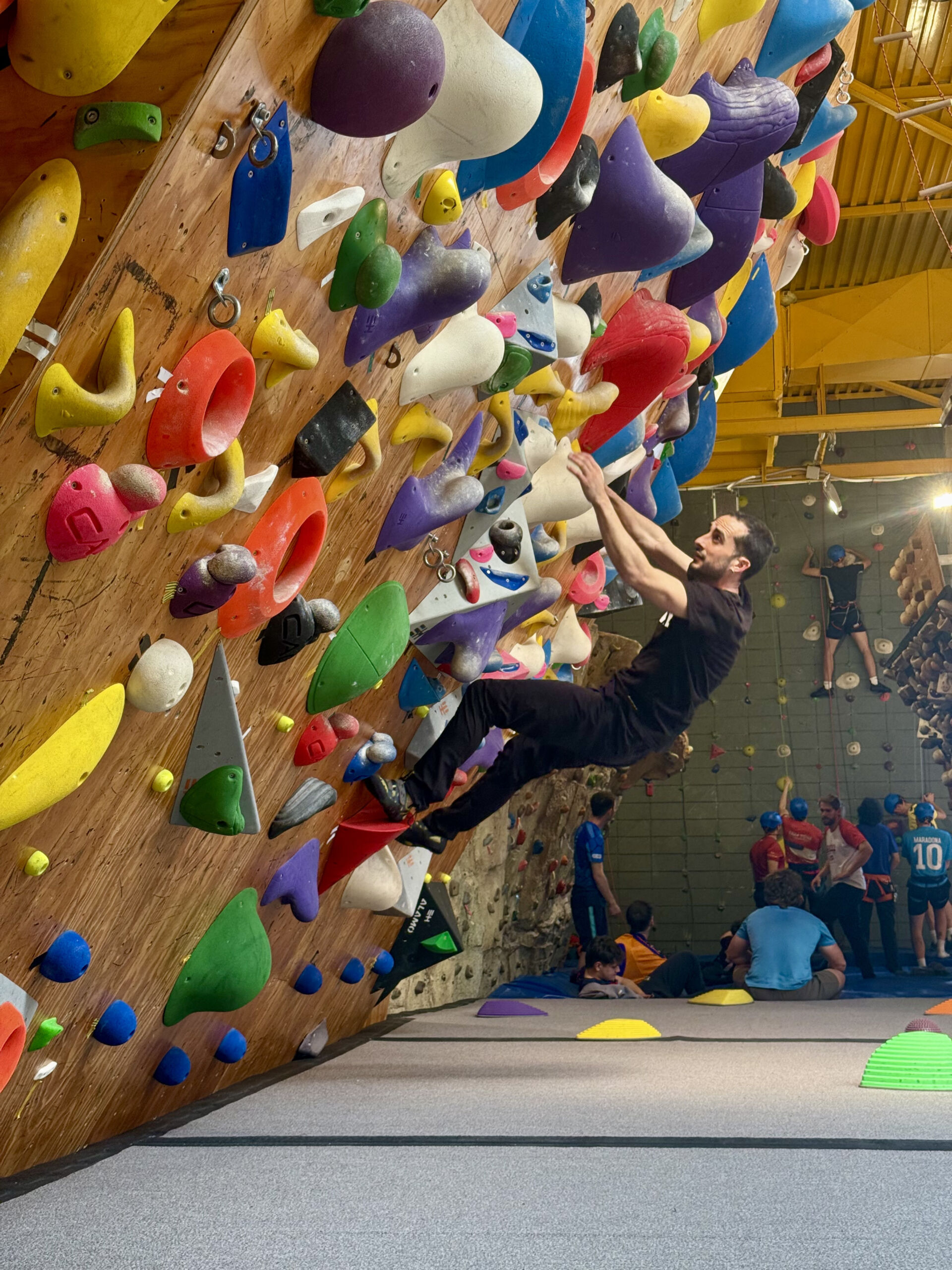 Aquesta activitat s’ha estructurat en tres espais diferenciats dins del rocòdrom. En el primer espai, l’alumnat ha realitzat un petit circuit de reptes que combinaven moviments d’agilitat i desplaçaments laterals en paret a poca alçada. En el segon, han practicat l’escalada de tipus “bloc”, una modalitat que consisteix en superar rutes curtes però intenses sense l’ús de cordes, tot treballant la tècnica i la força de manera progressiva. Finalment, en el tercer espai, han pogut experimentar l’escalada amb corda en paret vertical, aprenent també a assegurar als companys amb un dispositiu específic de seguretat.