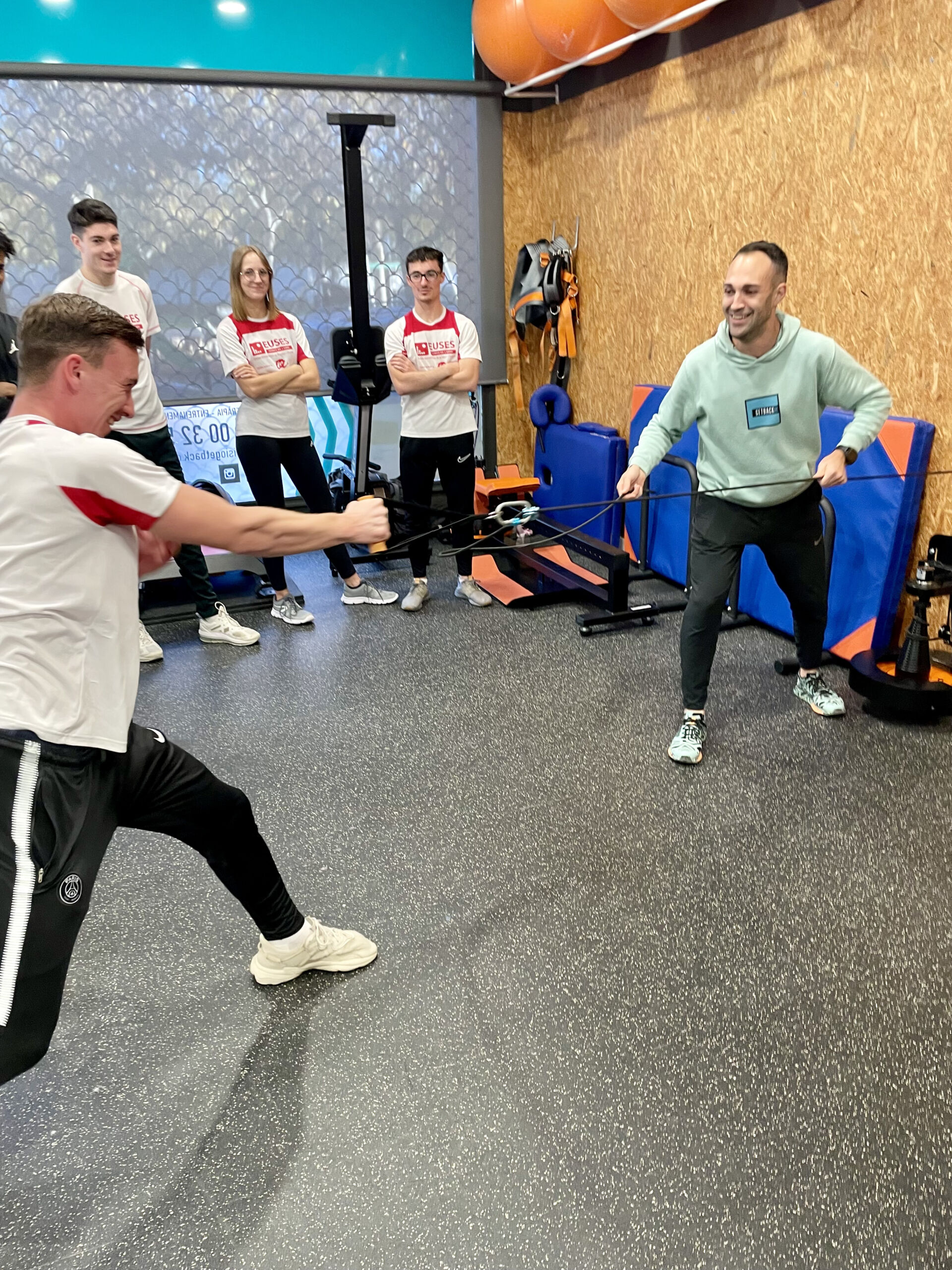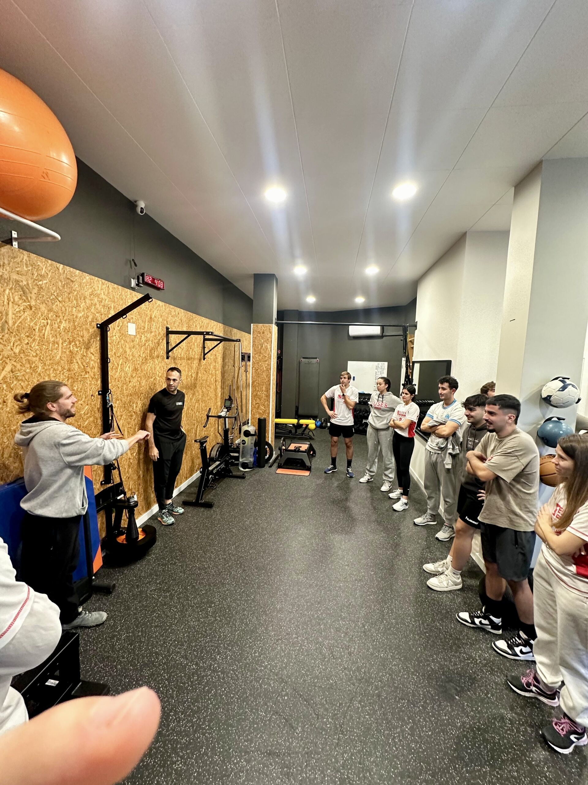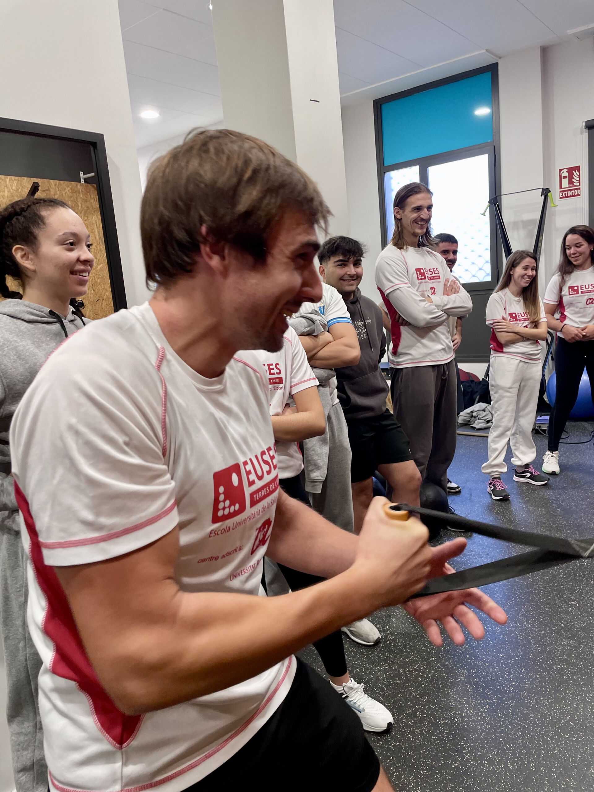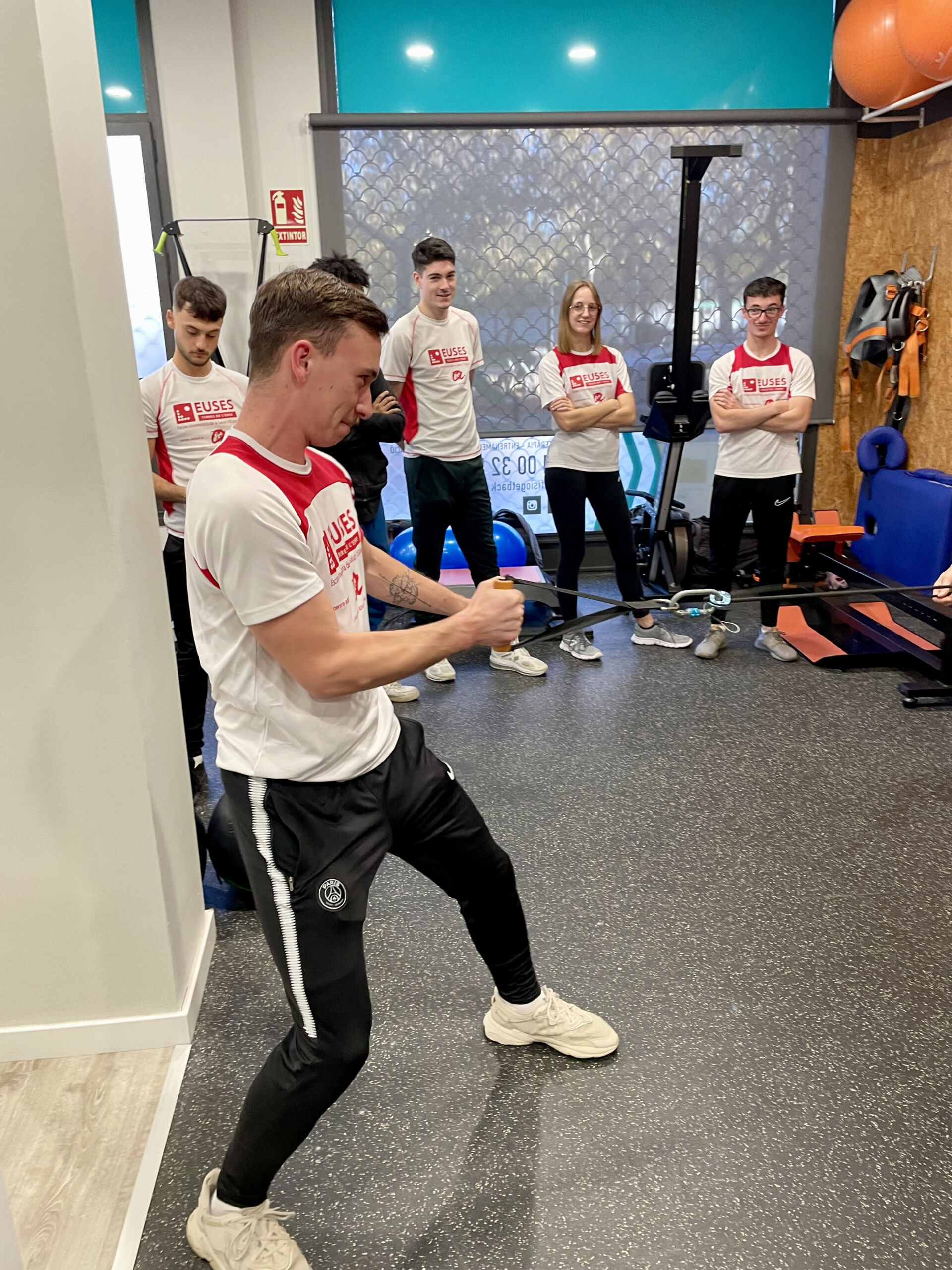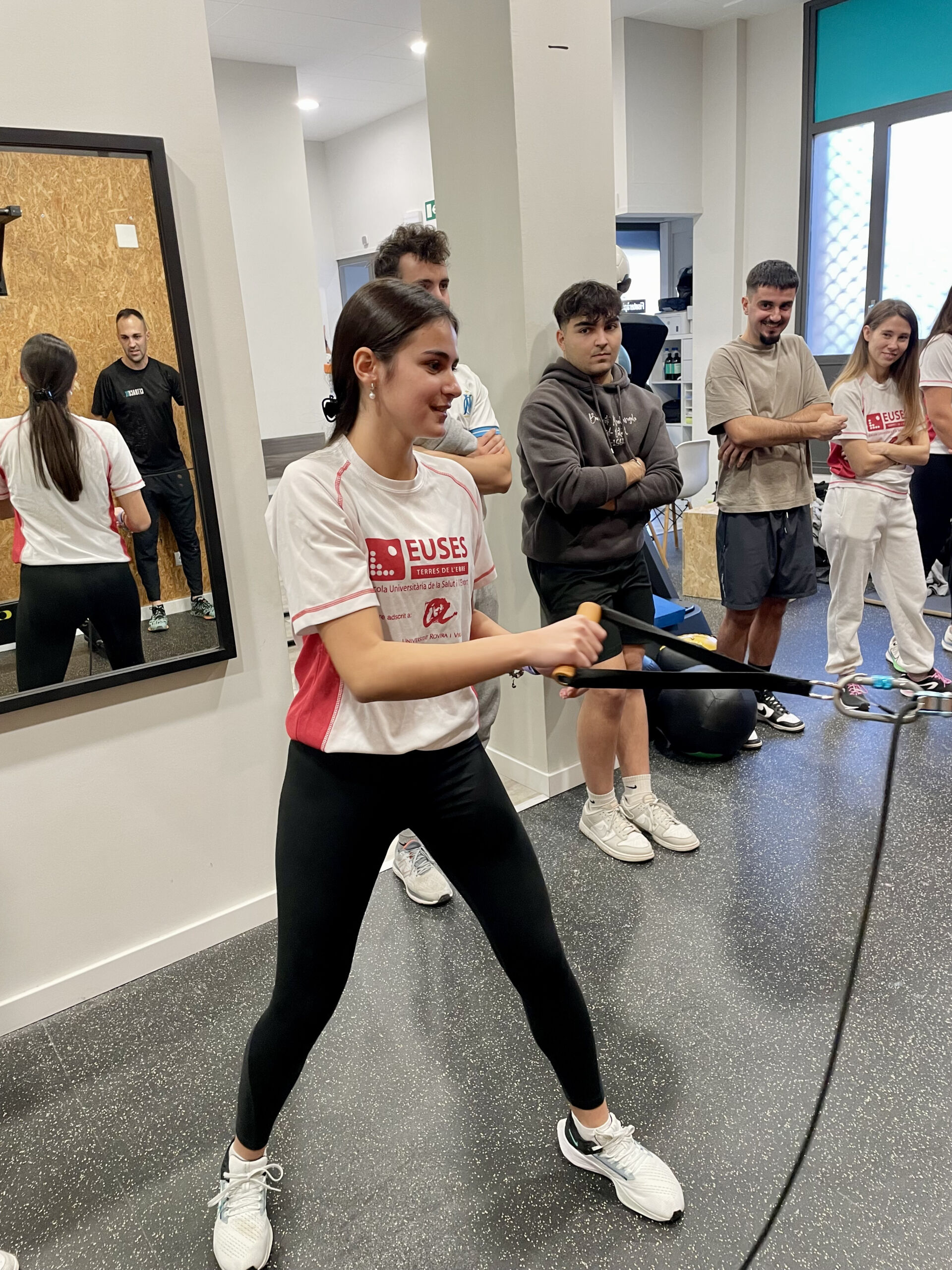 A continuació, els alumnes han visitat la zona de gimnàs, on han pogut veure tota la maquinària específica utilitzada per a la readaptació de lesions, incloent aparells isoinercials com les politges còniques i el “yoyo squat”, entre altres. Aquesta part de la pràctica els ha permès provar i entendre el funcionament de l’equipament i experimentar directament amb algunes de les tècniques i dispositius emprats per treballar en la recuperació de les lesions esportives.