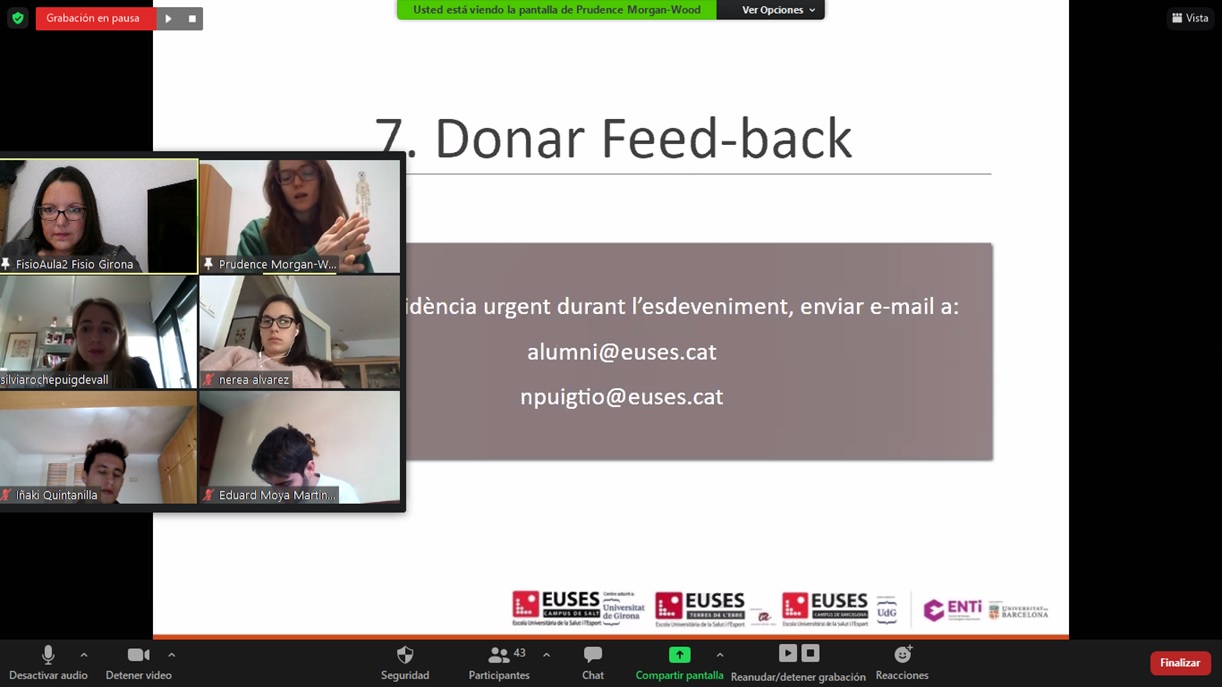 EUSES Alumni, together with the Practicum course for the Degree in Physiotherapy, organised for the seventh consecutive year a Tutor’s Day, which this time had an “online” format due to the Còvid 19 pandemic. The training, which was conducted through the Zoom platform, was attended by some forty people, including members of Alumni and fourth-year students from the Salt, Bellvitge and Terres de l’Ebre campuses. The talk was given by the heads of EUSES Alumni, such as the director Sílvia Roche and Prudence Morgan-Wood; and the lecturer and coordinator of the Practicum, Nuria Puigtió. During the talk, different topics were discussed, such as the details required to be able to form part of the group of tutors, the unified treatment protocol and the functions that tutors have to carry out during the student’s volunteering, as well as other more general aspects related to alumni.