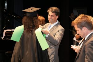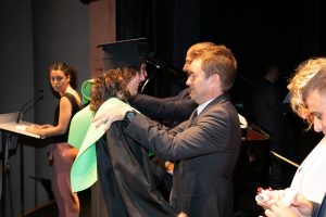 Posteriorment va ser el torn dels padrins de la promoció. Els professors Reyes Beltrán i José Vicente Beltrán van ser els del Grau en CAFE i Alba Aixendri i Juanfran Sales, els del Grau en Fisioteràpia. També van parlar els representants dels alumnes de cada grau (Genís Saborido i Cristina Gisbert de CAFE i Laura Samanes i Sebastian Anton de Fisioteràpia) els quals van lliurar l’orla de la promoció als respectius directors. La cloenda va anar a càrrec dels representants institucionals, Meritxell Roigé i Marc Fornós. L’himne universitari Gaudeamus Igitur va rubricar la cerimònia de la tercera graduació sortida de l’Escola Universitària de la Salut i l’Esport de les Terres de l’Ebre.