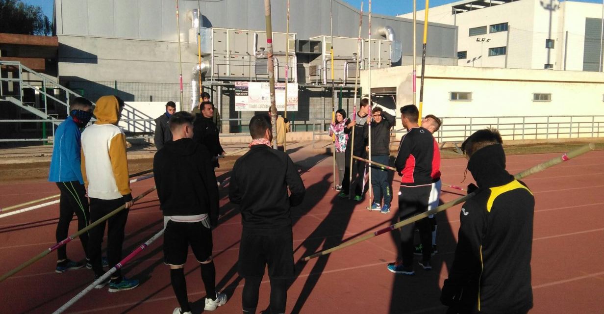 Alumnes del Grau en CAFE d’EUSES Terres de l’Ebre posen en pràctica el salt amb perxa amb Enric Obiol, entrenador del Centre de Tecnificació de Terres de l’Ebre i de la UA Montsià