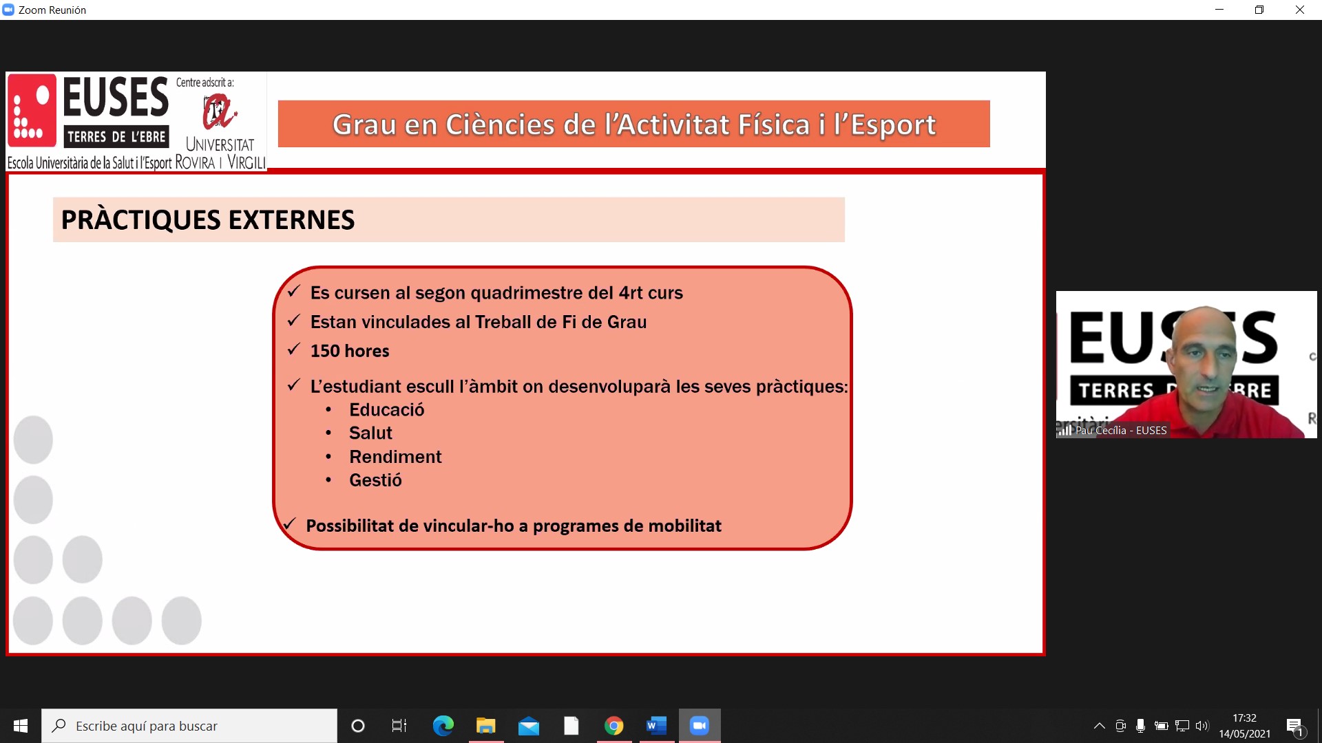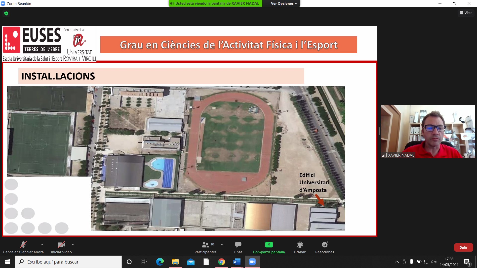 Este pasado viernes día 14 de mayo ha tenido lugar la última de las Jornadas de Puertas Abiertas virtuales de este curso en el Campus de Terres de l’Ebre. Cómo en las anteriores, se ha vuelto a contar con una buena cantidad de personas interesadas en los grados impartidos en nuestro Campus. De nuevo se ha utilizado como vehículo la plataforma Zoom, a través de la cual los y las interesadas han podido conectarse para recibir toda la información de nuestros estudios: el Grado en Ciencias de la Actividad Física y el Deporte, el Grado en Fisioterapia y la Doble Titulación (CAFyD + Fisioterapia).