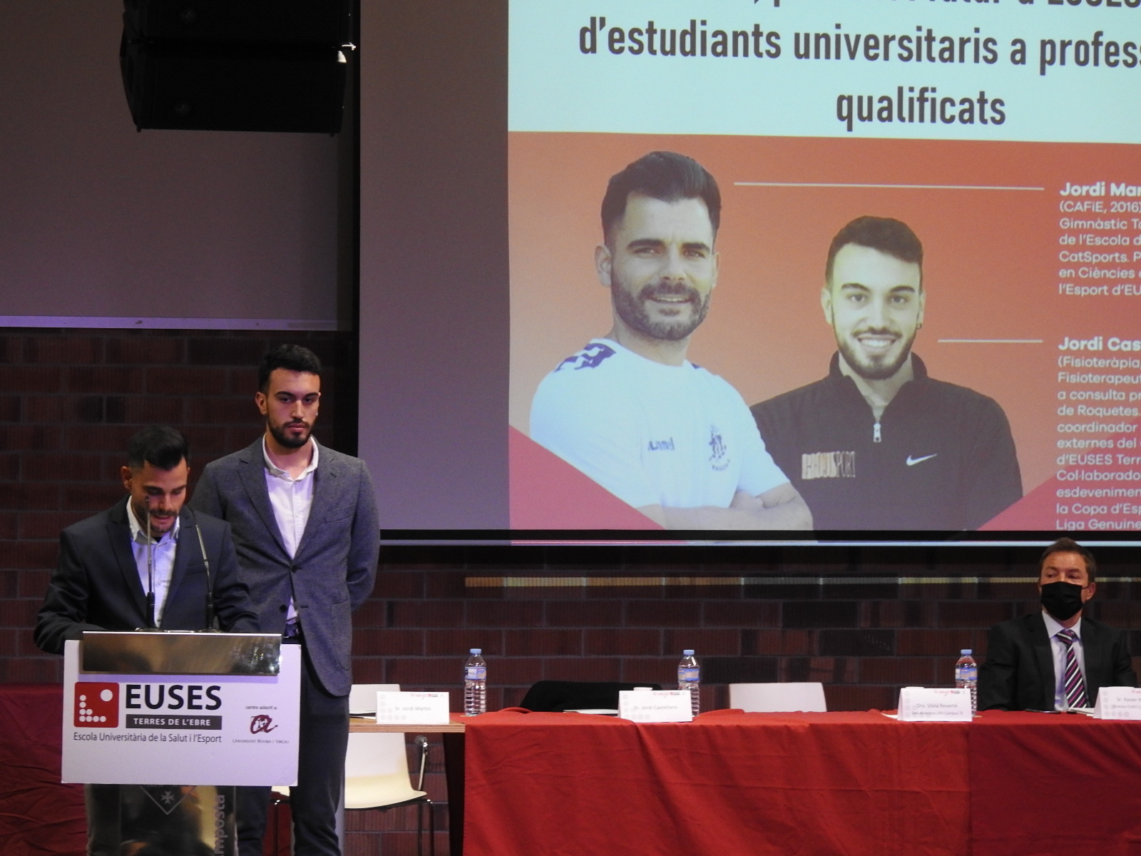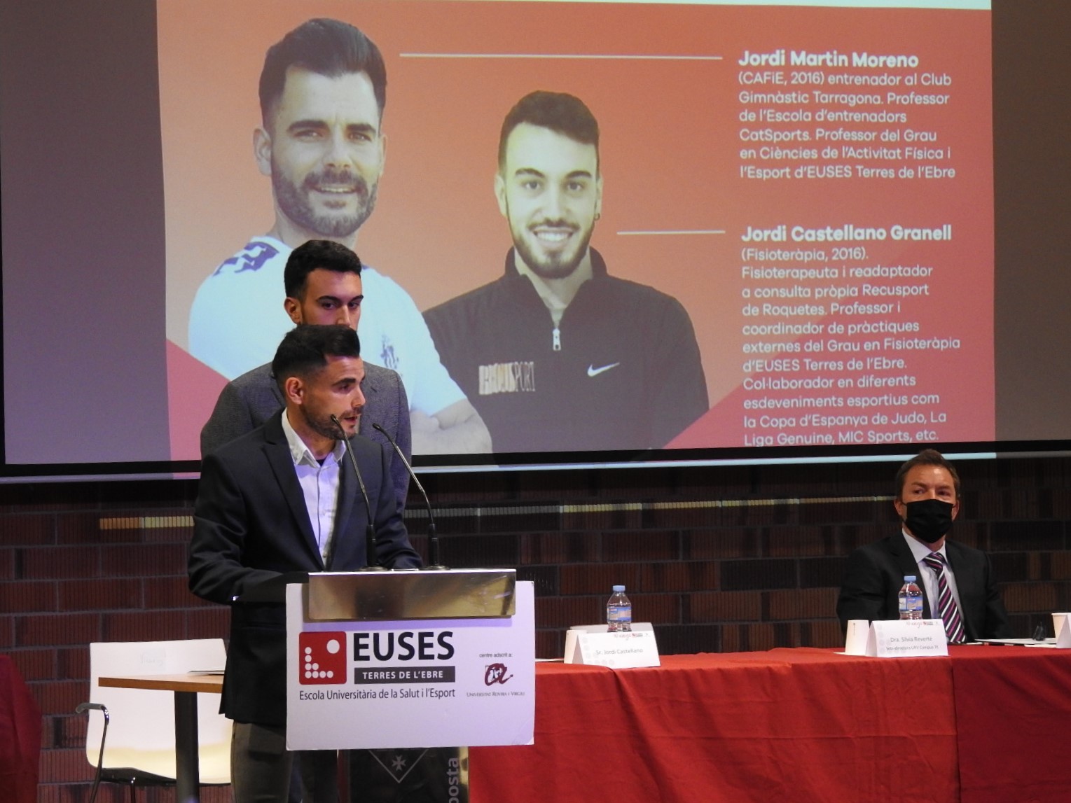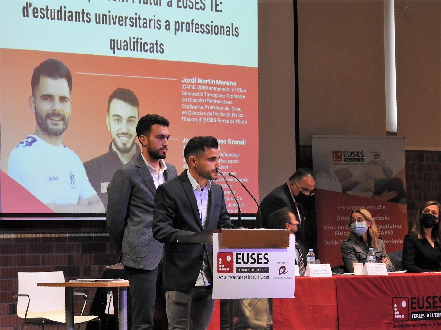 Este jueves ha tenido lugar en el Auditorio del Edificio Universitario de Amposta la IV Jornada Anual de EUSES Alumni a las Terres de l’Ebre, que ha tenido como actores principales a los ahora profesores Jordi Martín i Jordi Castellano, que fueron alumnos de EUSES y se graduaron en la primera promoción (2012/16) en CAFyD y en Fisioterapia, respectivamente. Los dos ponentes han hablado sobre “Pasado, presente y futuro en EUSES TE” y han ofrecido una pincelada desde su etapa académica hasta la profesional. Además de la docencia,  Jordi Martín es entrenador en el Club Gimnástic de Tarragona y profesor de la Escuela de Entrenadores CatSports; mientras que Jordi Castellano ejerce de fisioterapeuta con consulta propia a Recusport y es colaborador en varios acontecimientos deportivos como la Copa de España de Judo, la Liga Genuine, el MIC Sports, entre otros.