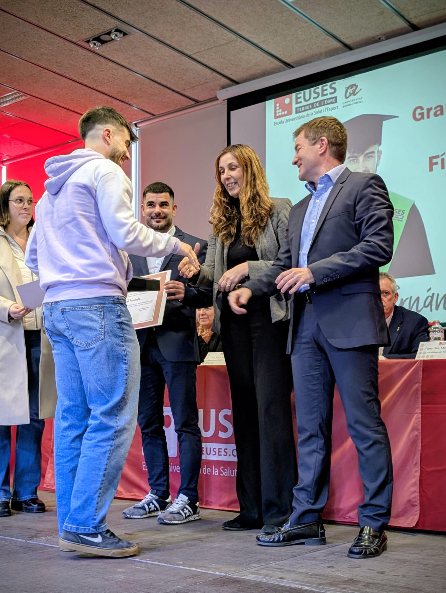 Seguidamente se ha ralizado la entrega de los reconocimientos a los mejores expedientes académicos de la 10ª promoción. En el Grado en Fisioterapia se ha distinguido a Emilien Degraix; en el Grado en CAFyD, a Jesús Tudó; y en la Doble Titulación (CAFyD+Fisioterapia), el premio ha sido para Nayara Fernandes. La entrega de los diplomas y las placas conmemorativas ha ido a cargo de Xavier Nadal, Nuria Darnés, Carla Curto (directora de Fisioterapia), el Dr. Ramon Aiguadé (decano y representante territorial del colegio profesional de Fisioterapia) e Iris Castell (representante del Colegio de Profesionales de la Actividad Física y del Deporte de Catalunya). El COPLEFC, además, ha obsequiado con un año de colegiación gratuita los premiados de CAFyD y Doble Titulación, así como al Mejor TFG de CAFyD del curso pasado, elaborado por Nuria Labòria.
