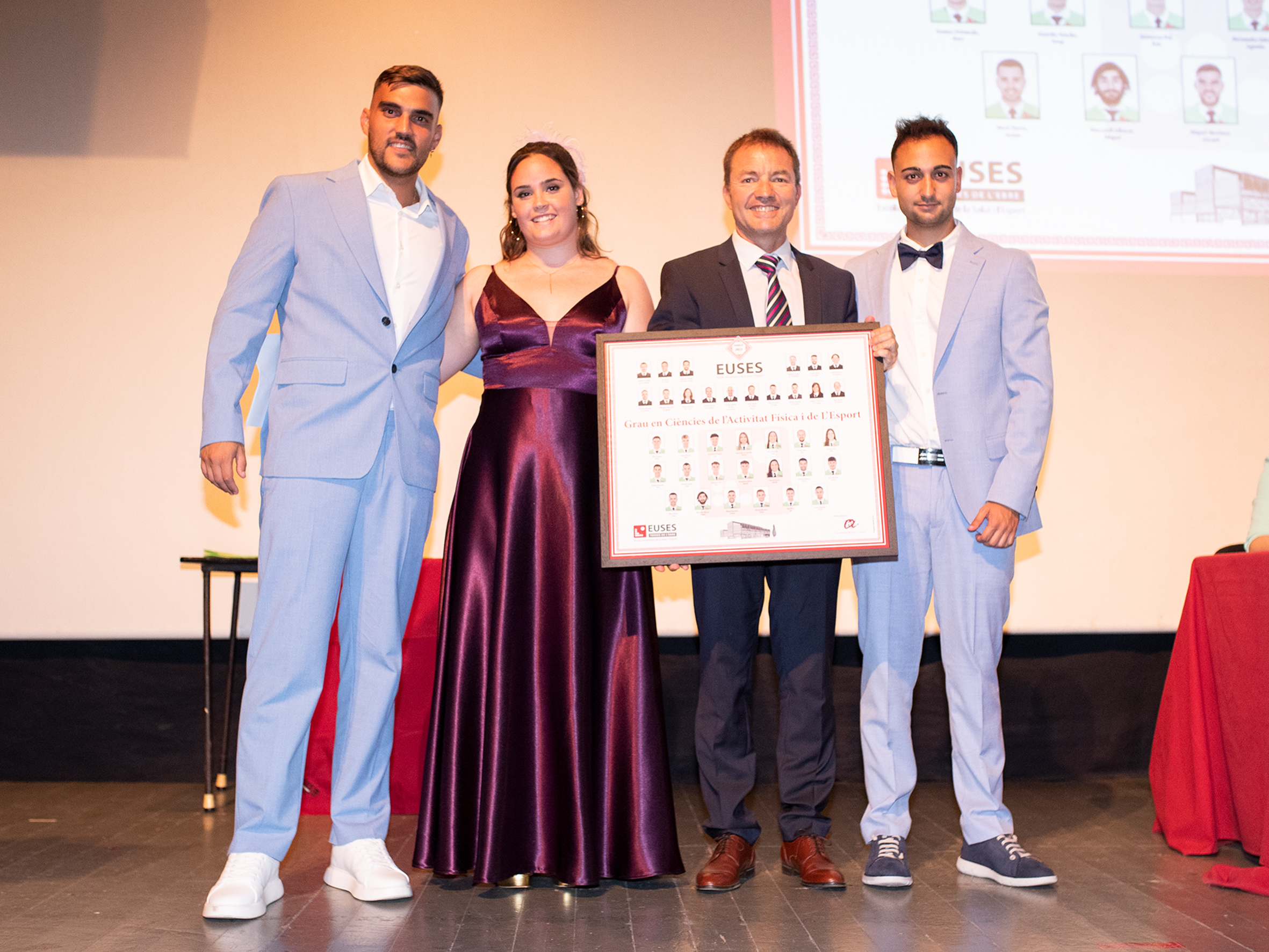 Uno de los momentos más efervescentes del acto ha sido, sin lugar a dudas, la entrega de diplomas y las becas con la subida al escenario de los estudiantes a medida que la responsable de secretaría, Montse Cid, iba diciendo sus nombres. Por parte de CAFyD han entregado las becas Xavier Nadal y Pau Cecilia (jefe de estudios del grado), mientras que los diplomas los han librado Adam Tomàs i Pere Manuel (presidente del COPLEFC). Por lo que se refiere al Grado en Fisioterapia, Carla Curto y Nuria Besalduch (jefa de estudios del grado) han librado las becas y Miquel Subirats (en representación de la presidenta de la Diputación de Tarragona, Noemí Llauradó) y Ramon Aiguadé (Decano del Colegio de Fisioterapeutas de Catalunya), han entregado los diplomas.
