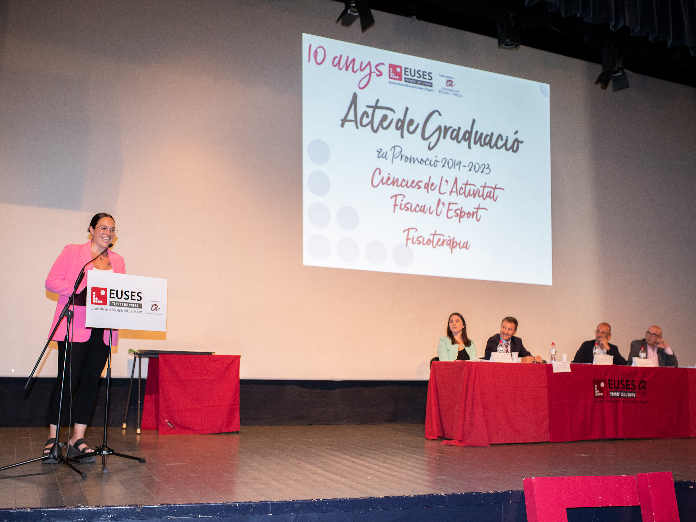 El Auditorio Octavi Ruiz de la Lira Ampostina ha sido el marco del Acto de Graduación de la 8ª Promoción de los grados en Ciencias de la Actividad Física y del Deporte y en Fisioterapia del Campus de Terres de l’Ebre, que ha tenido lugar este viernes con la presencia de los grandes protagonistas (20 estudiantes de CAFyD y 44 de Fisioterapia) además de autoridades, miembros de la dirección y del equipo docente de EUSES y familiares de los alumnos que iniciaron los estudios universitarios el 2019 y que este año se han graduado.