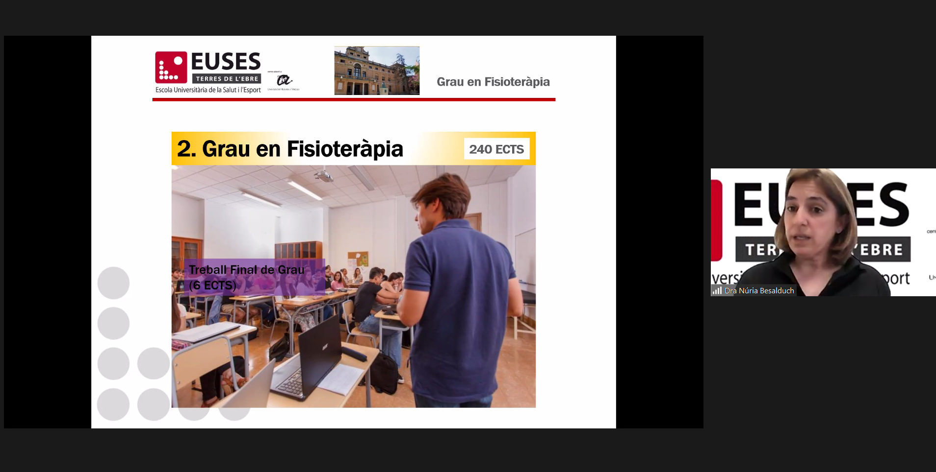Este viernes día 11 de febrero se ha celebrado en el Campus Terres de l’Ebre la primera de las Jornadas de Puertas Abiertas, que ha tenido formato virtual (on-line). Los directores del Campus y de los Grados han presentado la oferta formativa de EUSES TE en dos sesiones diferenciadas, una para CAFyD y otra para Fisioterapia. Los estudiantes interesados en la Doble Titulación han podido conectarse a ambas sesiones.