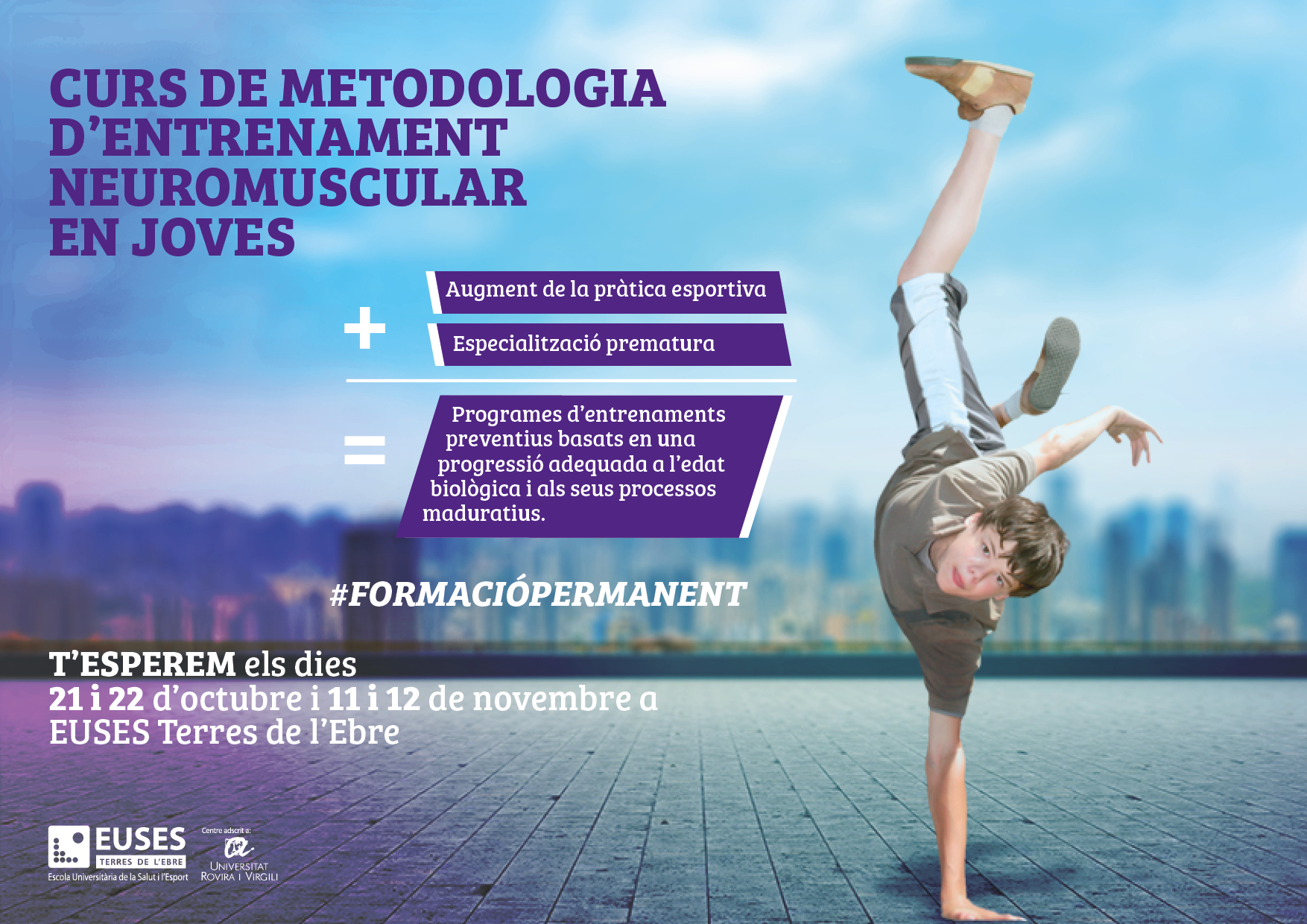 L’Escola Universitària de la Salut i l’Esport (EUSES-URV) promou la formació continuada adreçada als professionals de l’àmbit de l’esport. Els propers dies 21-22 d’octubre i 11-12 de novembre tindrà lloc el Curs de metodologia d’entrenament neuromuscular en joves, una formació innovadora i de qualitat, impartida per professors del Grau en Ciències de l’Activitat Física i l’Esport (CAFE) que compaginen la docència amb la preparació d’esportistes d’elit en diferents centres esportius. Cal destacar a professionals de la talla de: Marc Madruga, Coordinador del curs, readaptador esportiu i preparador físic a ReSport Clínic a Barcelona, amb una àmplia experiència en diferents centres i en l’entrenament d’esportistes professionals d’alt nivell; José Vicente Beltrán, Director tècnic del centre esportiu Trèvol Lleida i Pep Casadevall, Readaptador de lesions i Preparador físic a Novaelite Sports Performance Innovation i també, Readaptador esportiu a l’Acadèmia Sánchez Casal.