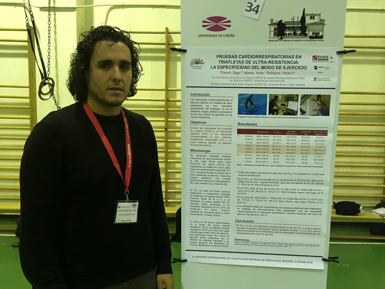 El professor d’EUSES Terres de l’Ebre Diego Chaverri ha estat present en el Congrés Internacional de l’Associació Espanyola de Ciències de l’Esport, que s’ha celebrat els dies 21, 22 i 23 de novembre a la Facultat de Ciències de l’Esport i de l’Educació Física de la Corunya (INEF Galícia). Diego Chaverri, que a EUSES imparteix l’assignatura de Teoria de l’entrenament I als alumnes de 2n curs del Grau en CAFE, ha presentat un treball que tenia per objectiu avaluar les respostes del consum d’oxigen i la freqüència cardíaca a la intensitat corresponent als llindars ventilatoris individuals i a la càrrega màxima durant un exercici incremental màxim en triatletes d’ultra-resistència. A més a més, també va col·laborar en una altra presentació que tenia per objectiu caracteritzar les respostes cardiorespiratòries, metabòliques i cinemàtiques en assalts a 5 i 15 tocats en una competició simulada en floret masculí i femení en tiradors d’elit d’esgrima.