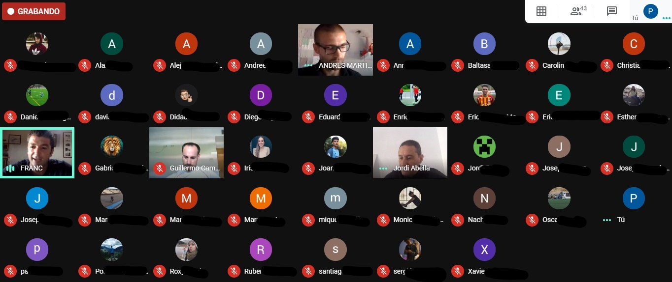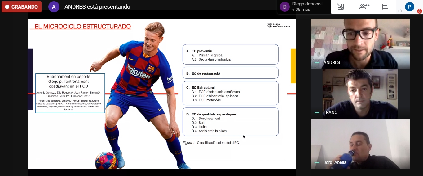 Los alumnos de 2º y 3º curso del Grado en Ciencias de la Actividad Física y el Deporte de la asignatura de Deportes de Equipo 1 y 2 (Fútbol) que imparten los profesores Guillermo Camarero y Jordi Abella han podido disfrutar de la presencia virtual por la plataforma Meet del entrenador del juvenil A del FC Barcelona, Franc Artiga; y del preparador físico del mismo equipo, Andrés Martín. Los dos técnicos han ofrecido una master class sobre el Entrenamiento Estructurado (E.E.) y de cómo se aplica en los diferentes equipos del Fútbol Formativo del FC Barcelona. Franc Artiga y Andrés Martín han hecho especial incidencia en los microciclos del juvenil A en las diferentes fases de la sesión del entrenamiento: fase preparatoria/de introducción; fase de optimización/principal y fase de vuelta a la calma/informativa.