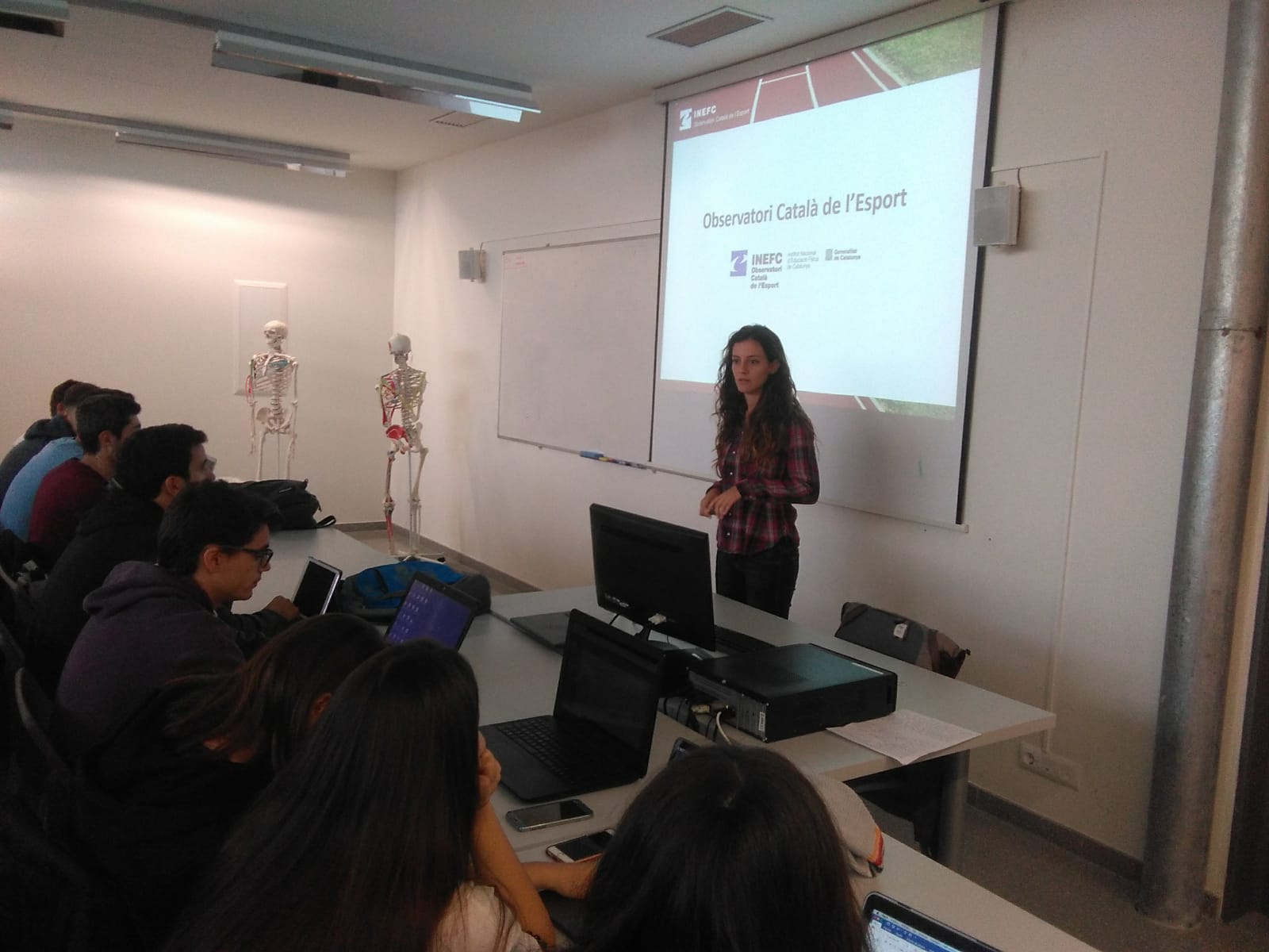 Els estudiants de 1r curs del Grau en Ciències de l’Activitat Física i l’Esport han pogut gaudir d’una xerrada a càrrec de la professora Míriam Rocher, representant de l’Observatori Català de l’Esport. La ponència de Míriam Rocher s’ha emmarcat dins l’assignatura d’Història i Fonaments socio-culturals de l’Activitat Física i l’Esport que imparteix la professora Sílvia Puigarnau i la ponent ha explicat als futurs graduats en CAFE la història i creació de l’Observatori, així com les tasques i estudis que està realitzant.