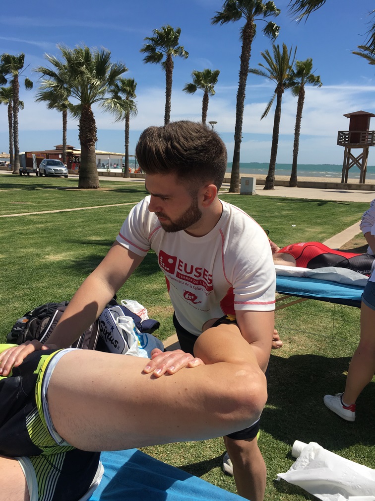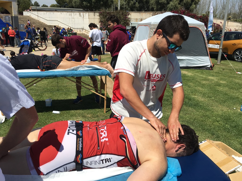Aquest passat 23 d’abril, 15 alumnes del grau de Fisioteràpia d’EUSES Terres de l’Ebre (Adrián Bel, Diego Borràs, Victor Torrens, Mario Prestamo, Albert Gàlvez, Lucia Navarro, Laure Nuel, Etienne Marzol, Auriane Motte, Camille Pages, Cèlia Zaid, Sebastien Anton, Lydia Mestre, Julian Bonnus i Mathieu Martin) van participar com a voluntaris al Triatló de Sant Carles de la Ràpita, realitzant massatges de descàrrega i recuperació a uns 300 corredors quan aquests finalitzaven la cursa. El recorregut consistia en realitzar 3000 metres nedant, 90 km en bicicleta i 20 km corrents.