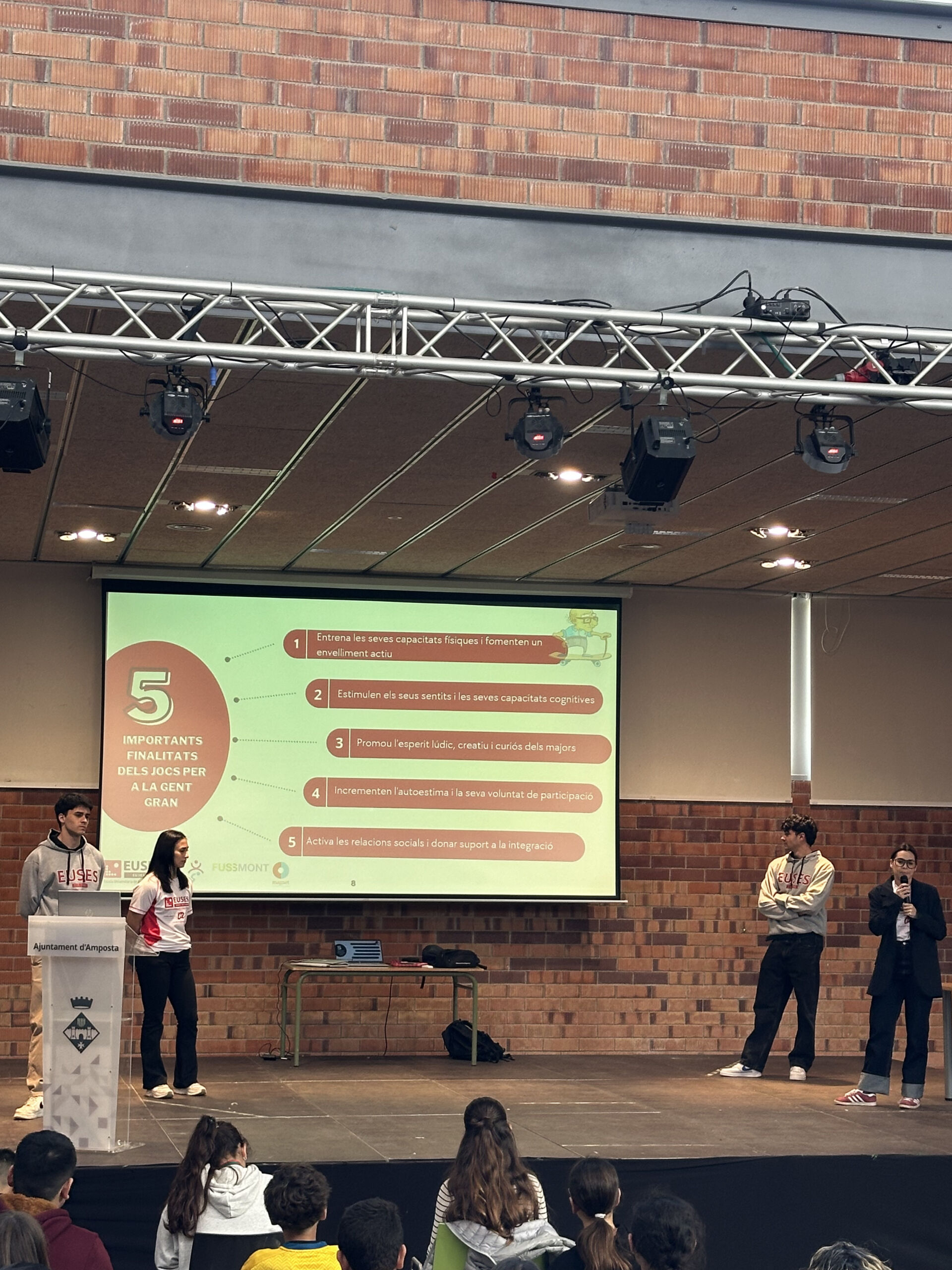 Estudiants de 3r de CAFE presenten als alumnes de 6è de l’escola Soriano Montagut les conclusions d’un estudi dels beneficis de l’exercici físic per a gent gran
