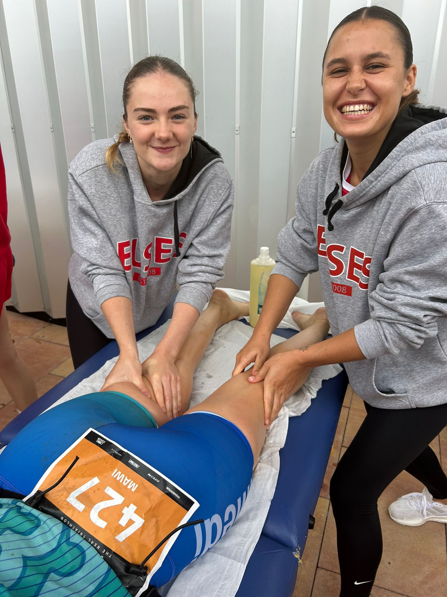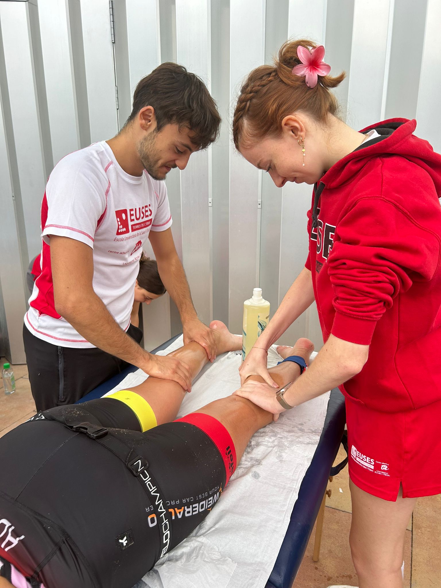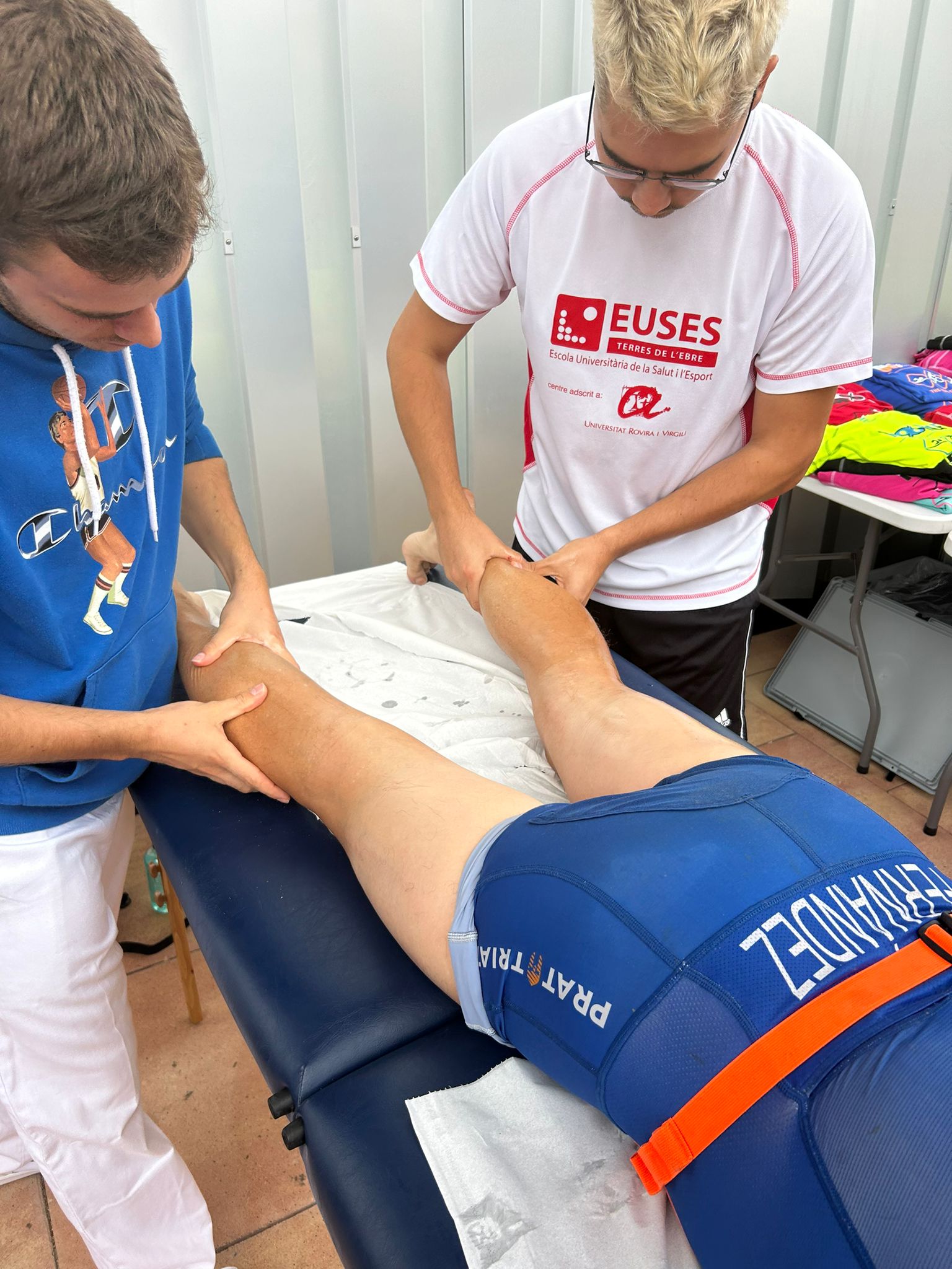 Aquest diumenge s’ha celebrat el 100×100 Half el Vendrell, un Triatló en el qual els participants podien escollir entre diferents distàncies (Sprint, Olympic, Half, Short, Aquabike L i Aquabike M) i en el qual EUSES hi ha col·laborat amb estudiants del Grau en Fisioteràpia tant del campus de Terres de l’Ebre com del Campus de Salt. Sota la supervisió de la fisioterapeuta d’EUSES Alumni Aimee Guinovart, els estudiants que s’han concentrat en una zona habilitada per a la recuperació dels esportistes han estat Maxime Blaise, Alexis Boilot, Justine Marty, Camille Soula i Clarisse Mira (Terres de l’Ebre) i  Matthis Carrère, Julie Lafon i Anaïs Tulloue (Salt). Allà han realitzat massatges i estiraments per accelerar la recuperació muscular dels participants que així ho han desitjat.