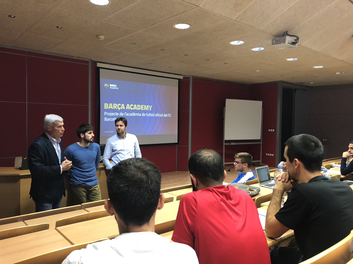 Els alumnes del Grau en Ciències de l’Activitat Física i de l’Esport d’EUSES i els exestudiants associats a EUSES Alumni han pogut gaudir aquesta tarda d’una xerrada per part del Director Tècnic de Barça Academy, Isaac Guerrero, i del coordinador tècnic i responsable de les àrees Europa, Àfrica i Orient Mitjà de Barça Academy, Marc Quintana, a l’Aula Magna del centre universitari del Campus de Salt. Els ponents han exposat als assistents, més d’una seixantena, el projecte internacional Barça Academy i també ha explicat els processos de selecció d’entrenadors que se segueix per captar tècnics i incorporar-los en les diverses acadèmies de futbol base que el FC Barcelona té arreu del món. Isaac Guerrero i Marc Quintana han estat acompanyats pel professor d’EUSES Pere Gratacós, que és el cap de l’àrea de formació de formadors del FC Barcelona i un tècnic vinculat des de fa molts anys al club blaugrana.