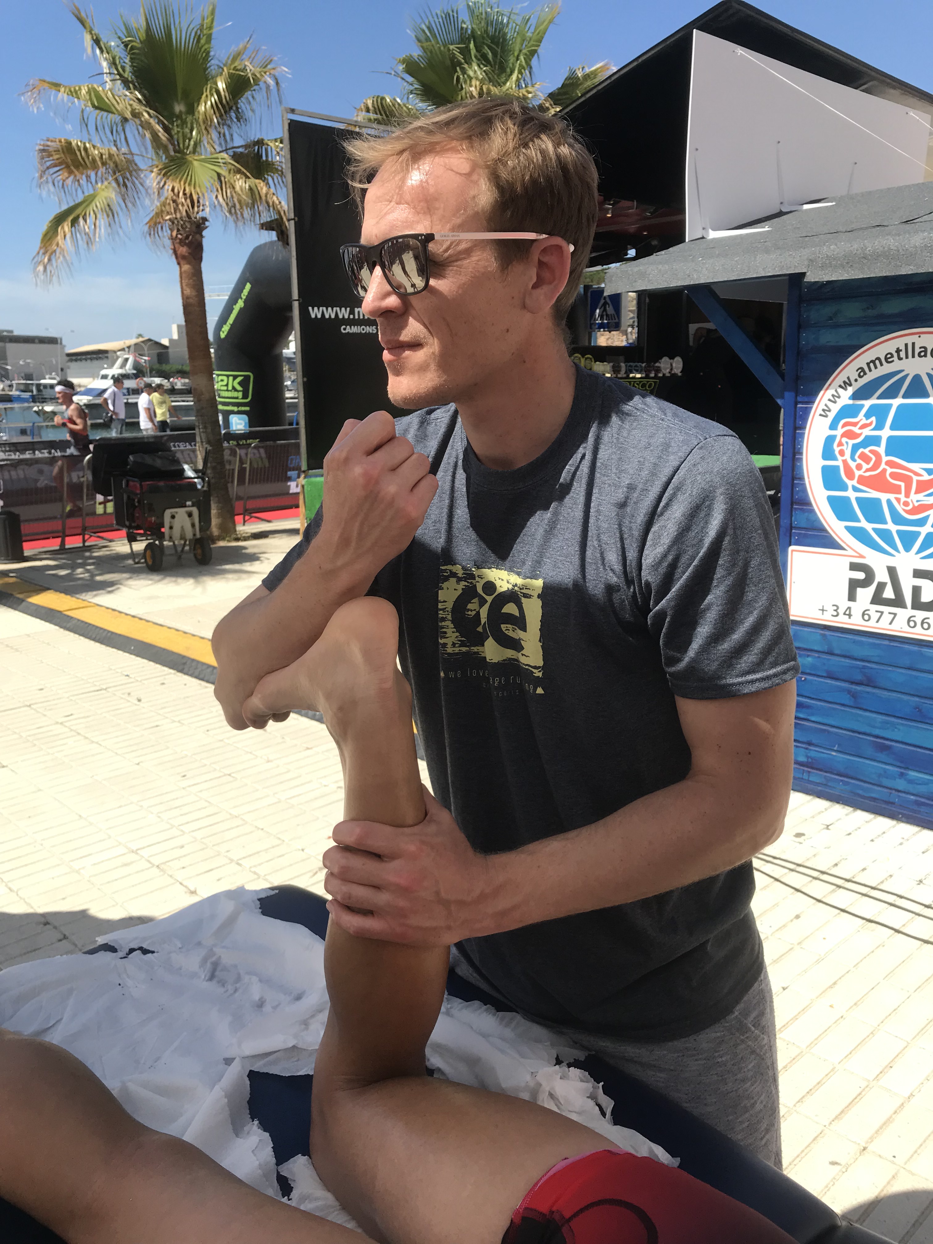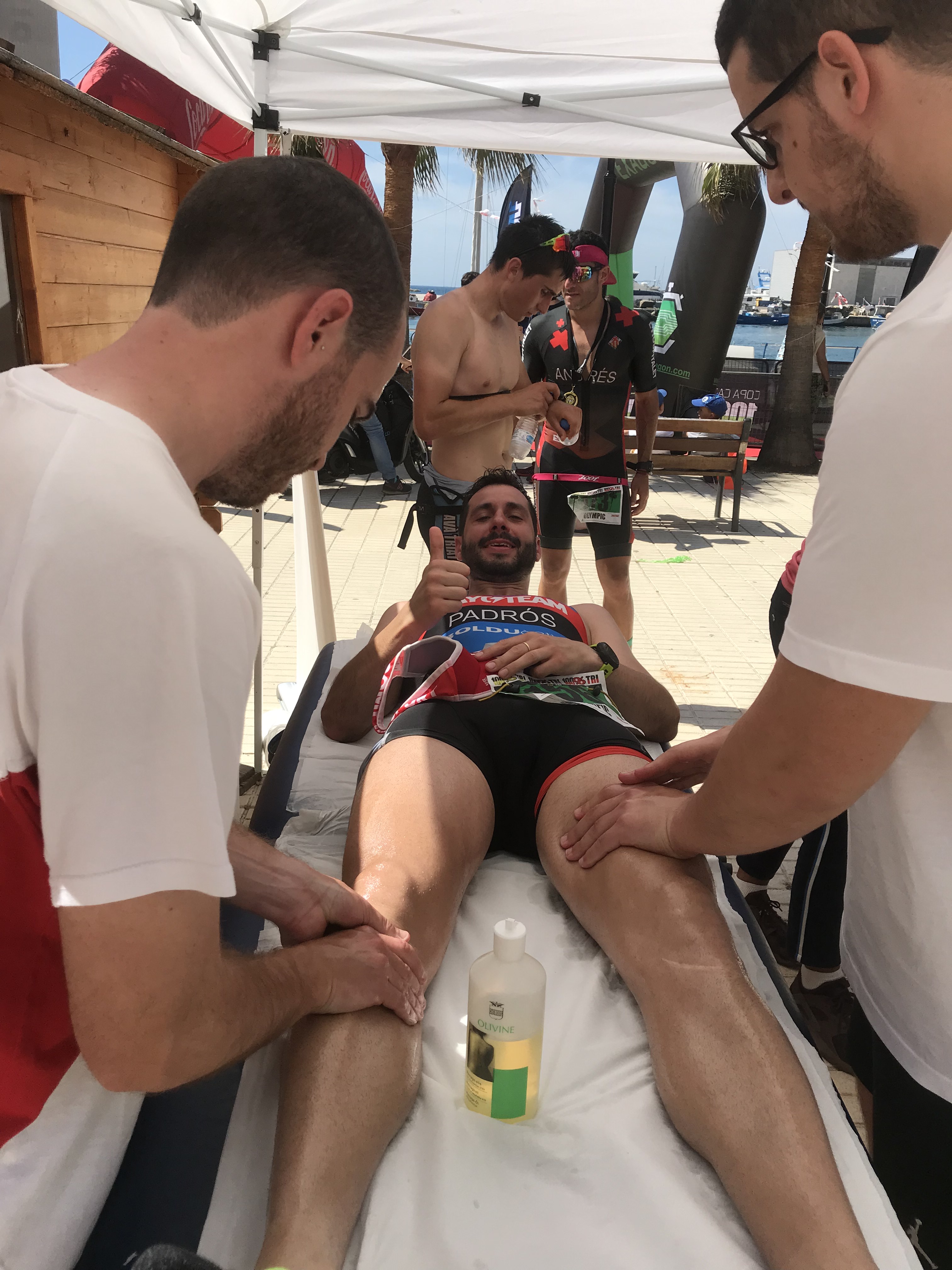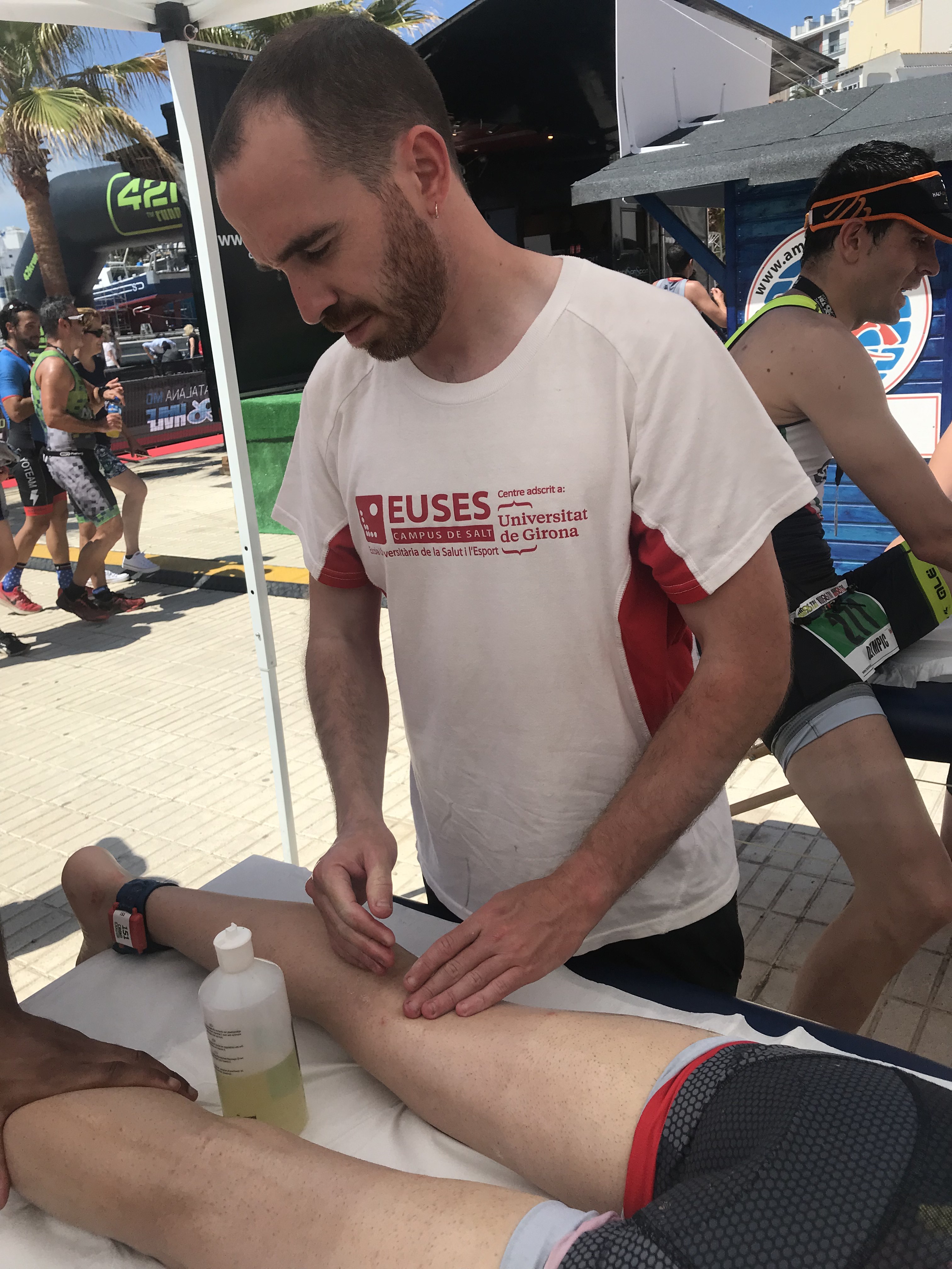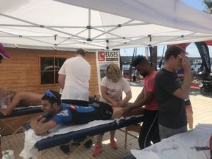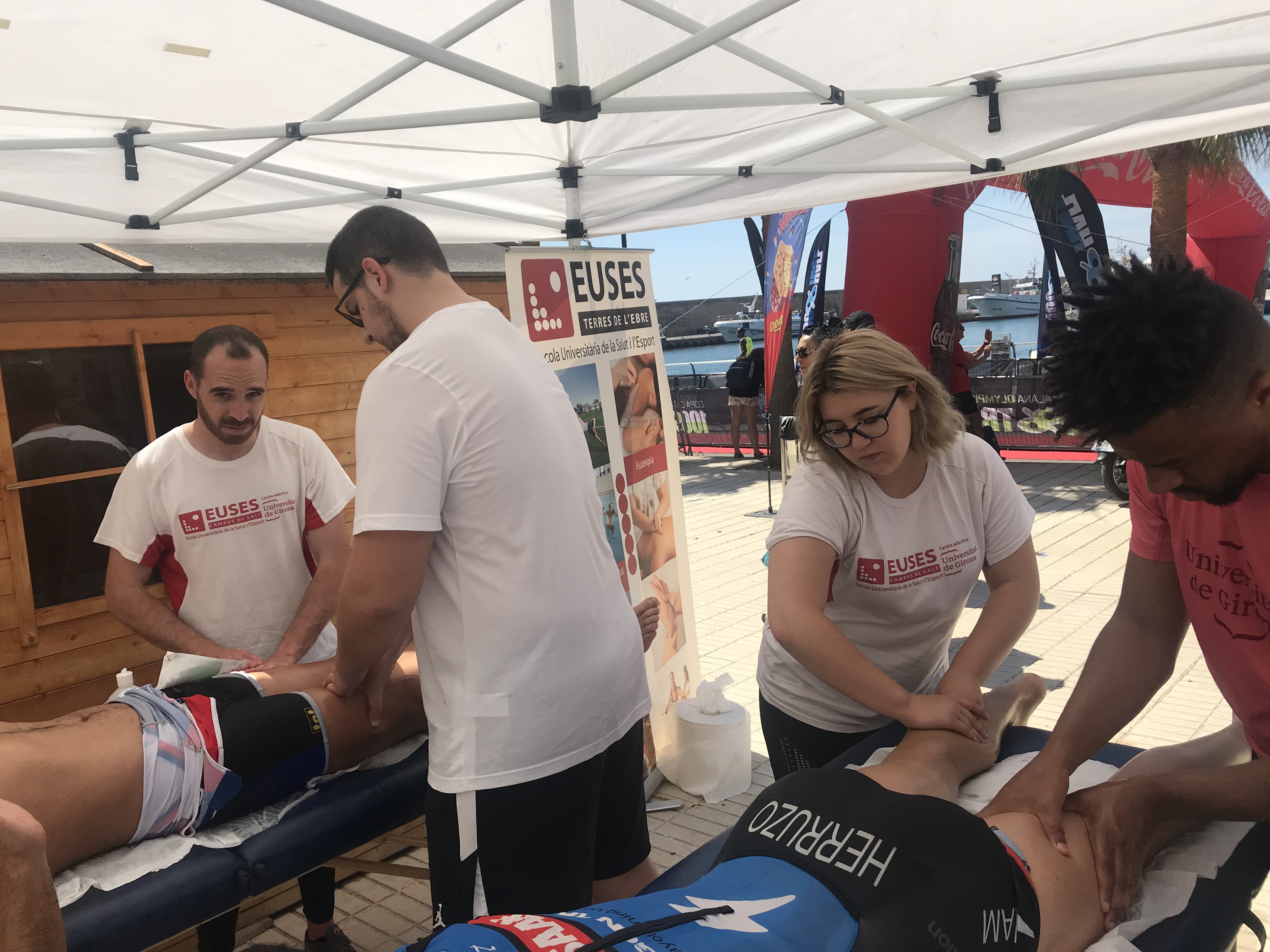 La fisioteapeuta d’EUSES Alumni de les Terres de l’Ebre Inés Lasat va tutoritzar, aquest diumenge, els estudiants del Grau en Fisioteràpia Inés Esperón, Clément Berkouk, Martí Brunsó, Pierre Lavandier, Xavi Garrido, Míriam Fraga, Marc Egea i Kenny Gbogbohoundada en la zona de recuperació que es va habilitar prop de l’arribada del Triatló de l’Ametlla de Mar, una prova organitzada per 100% Half i amb la qual EUSES ha tancat els voluntariats acadèmics del curs 2018/19. Inés Llasat va supervisar el paper dels alumnes, que van realitzar massatges i estiraments musculars als esportistes que van completar una prova de moltíssima exigència i que va constar d’un sector de natació d’1,9 quilòmetres; un de bicicleta de 90 quilòmetres i una cursa a peu de 21 quilòmetres.