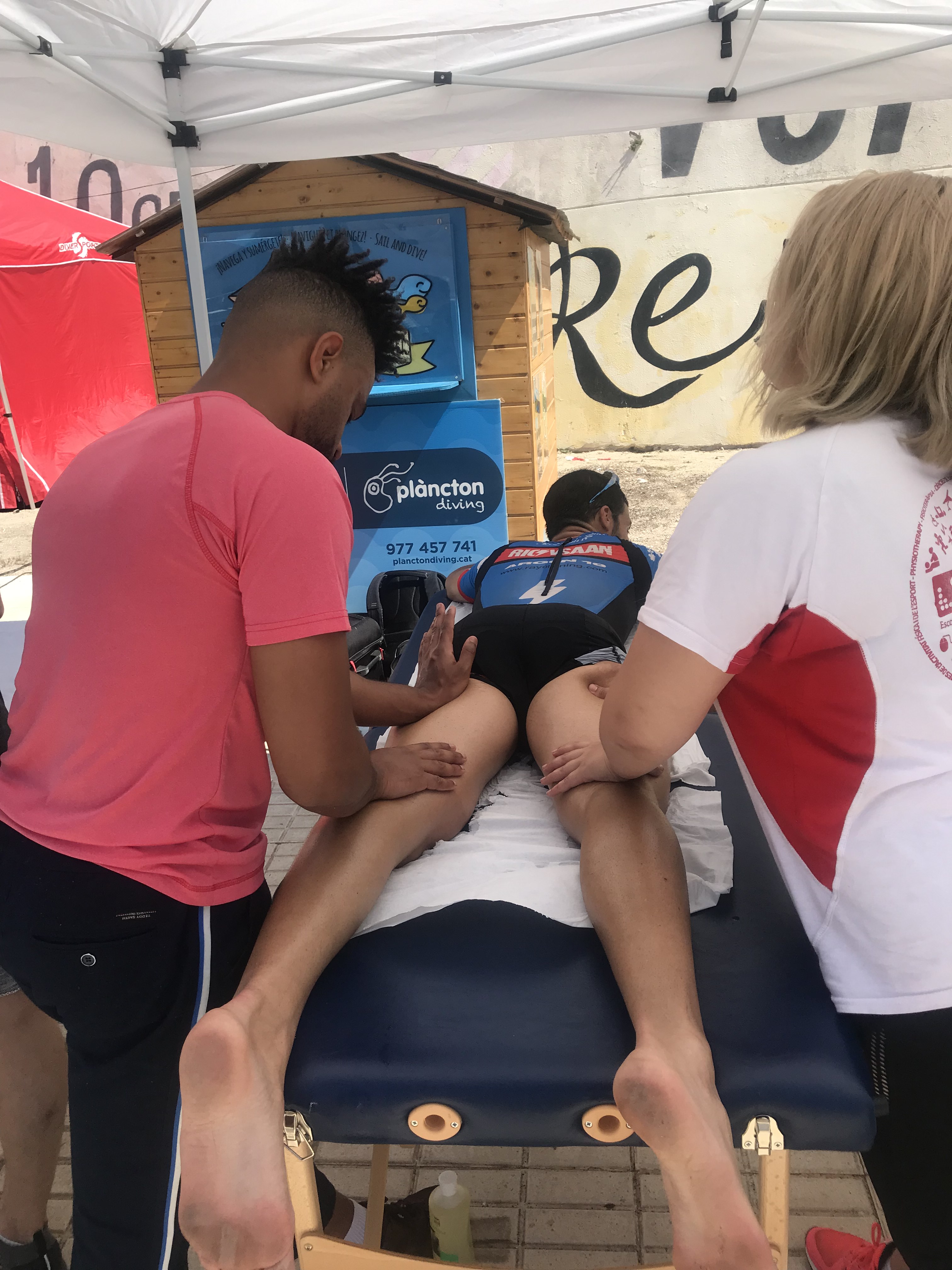 La fisioterapeuta d’Alumni Terres de l’Ebre Inés Lasat tutoritza els estudiants en la zona de recuperació del Triatló de l’Ametlla de Mar