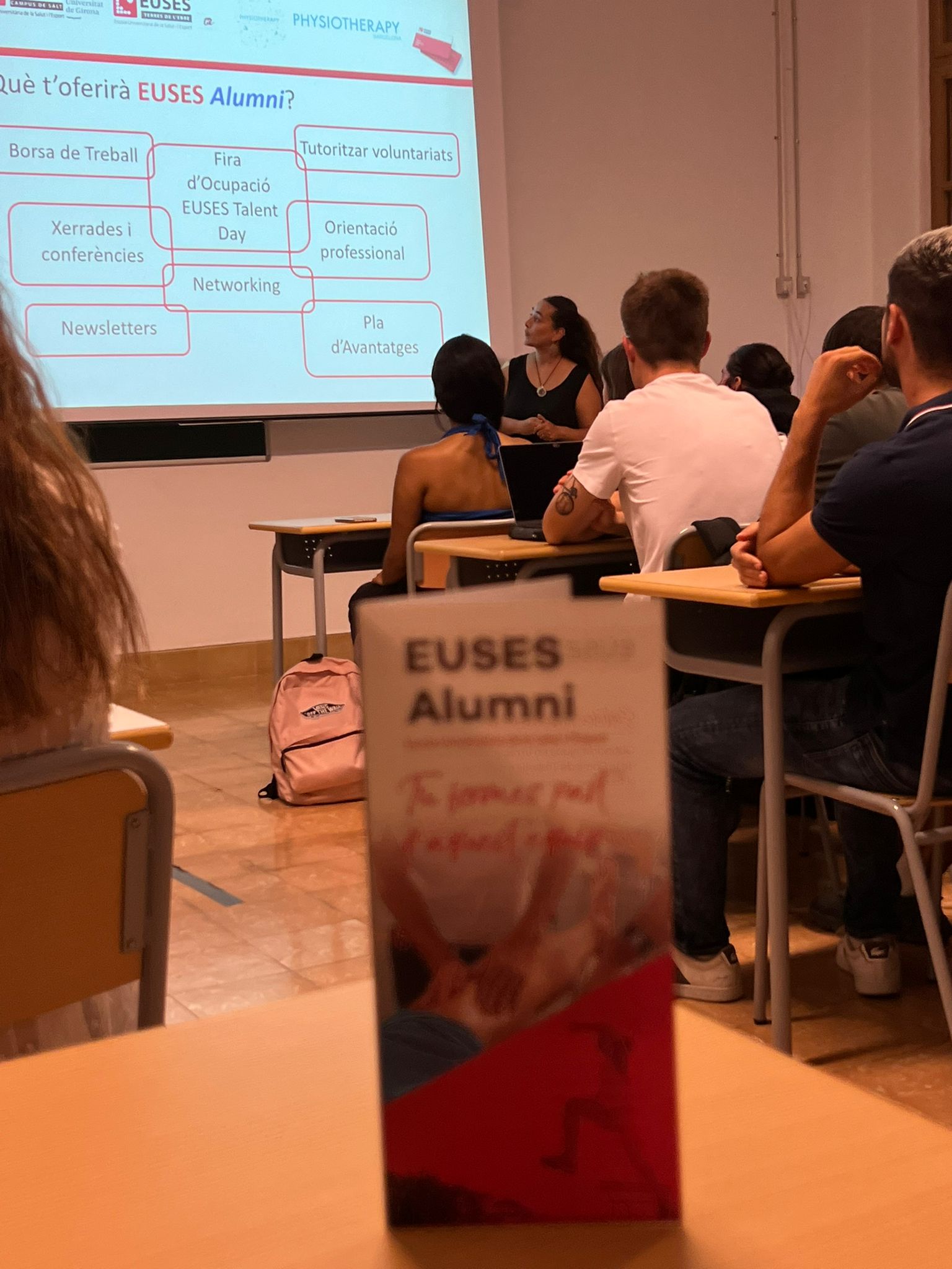 La responsable d’EUSES Alumni en el Campus Terres de l’Ebre, Meri Cecília, ha presentat aquest dimecres l’associació de graduats i graduades de l’Escola Universitària de la Salut i l’Esport als alumnes de 4t de CAFE i de Fisioteràpia. Meri Cecilia ha explicat que EUSES Alumni és un servei totalment gratuït per als graduats i graduades dels tres Campus d’EUSES i que es una associació que té com a objectiu acompanyar els seus membres en el seu pas de la vida acadèmica a la laboral i més enllà, posant al seu abast diferents eines com serveis d’orientació, elaboració de currículums, preparació d’entrevistes laborals, etc. Un altre dels productes estrella d’Alumni és la Borsa de Treball, que en els 10 anys de vida de l’associació ha publicat més de 1500 ofertes de feina.
